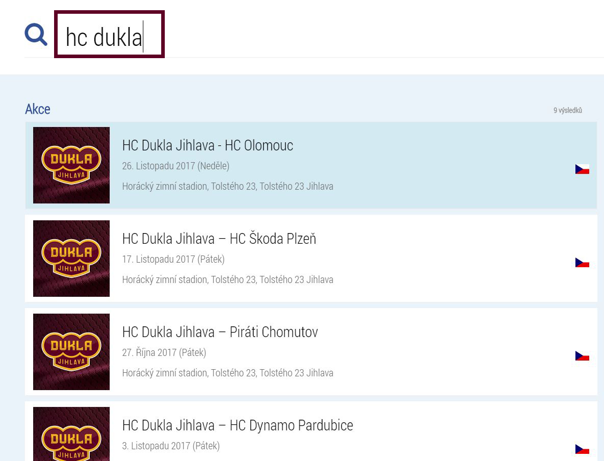 - Na hlavní stránce Ticketportalu najet na tlačítko Hledej a napsat např. HC Dukla