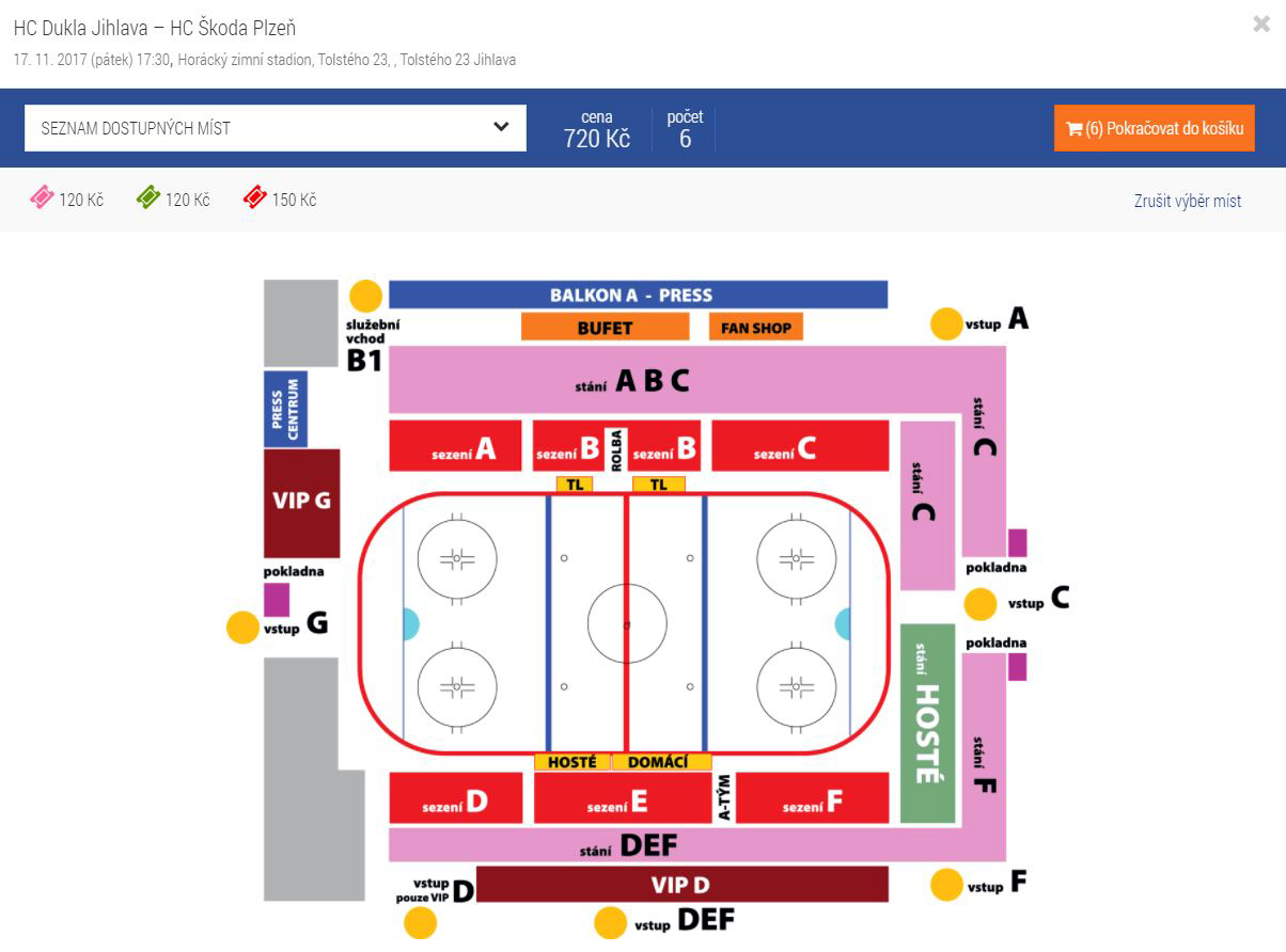 - Jeden uživatel může koupit maximálně 6 vstupenek. V sektorech na sezení je nutné zvolit požadované místo