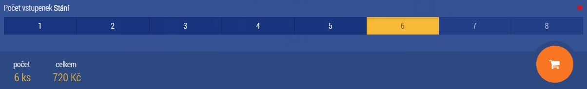 - Při kliknutí do sektoru na stání je v dolním modrém pásu možné zvolit počet vstupenek
