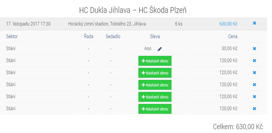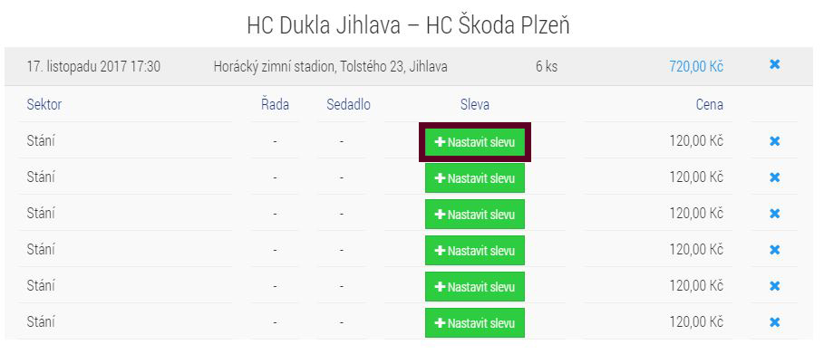 - Po vybrání sektorů a počtu lístků je možné v nákupním košíku označit slevu - pro děti na stání. Stačí kliknout na svítivé zelené tlačítko Nastavit slevu a potvrdit slevu "Dítě na stání"