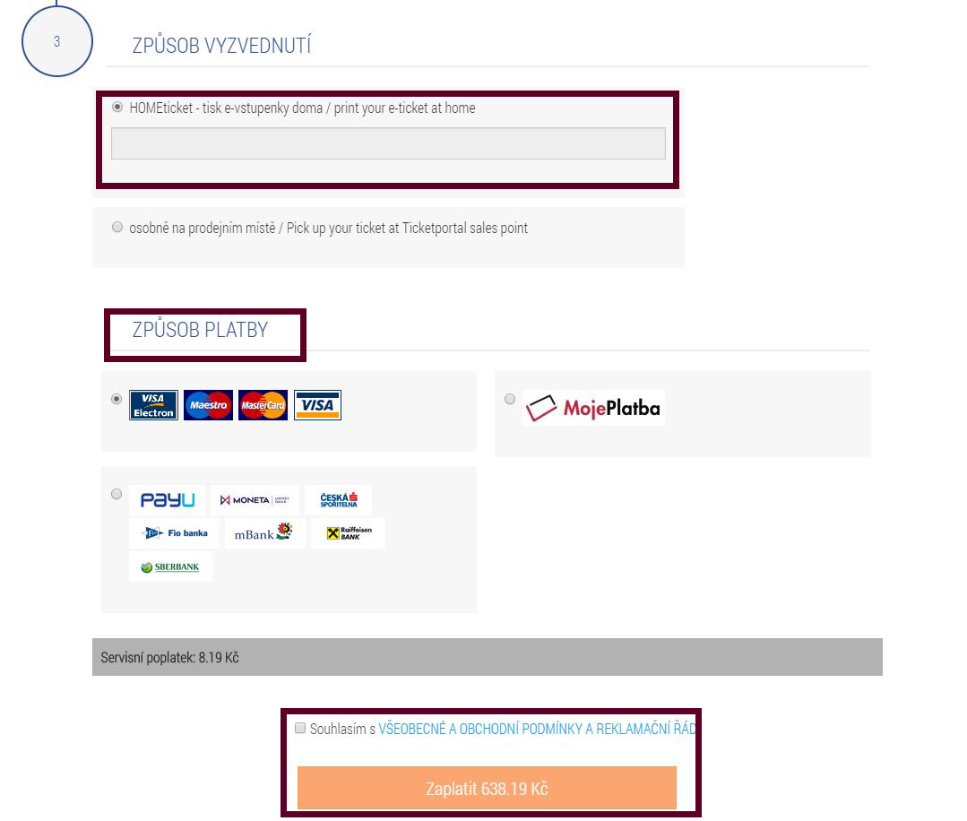 - Uživatel si poté může zvolit, zda si vstupenky rezervuje nebo zaplatí kartou online. V případě platby kartou je možné zaplacené vstupenky vytisknout doma (uživateli přijde e-mail s elektronickou vstupenkou k tisku)