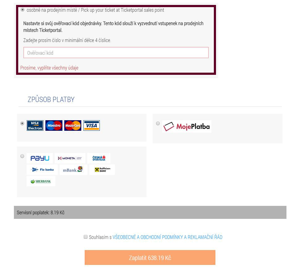 - Nebo vstupenky zaplatit a vyzvednout na některém z Prodejních míst Ticketportalu - tom případě musí uživatel zadat minimálně 4 číselný kód, který při vyzvednutí vstupenky řekne na prodejním místě