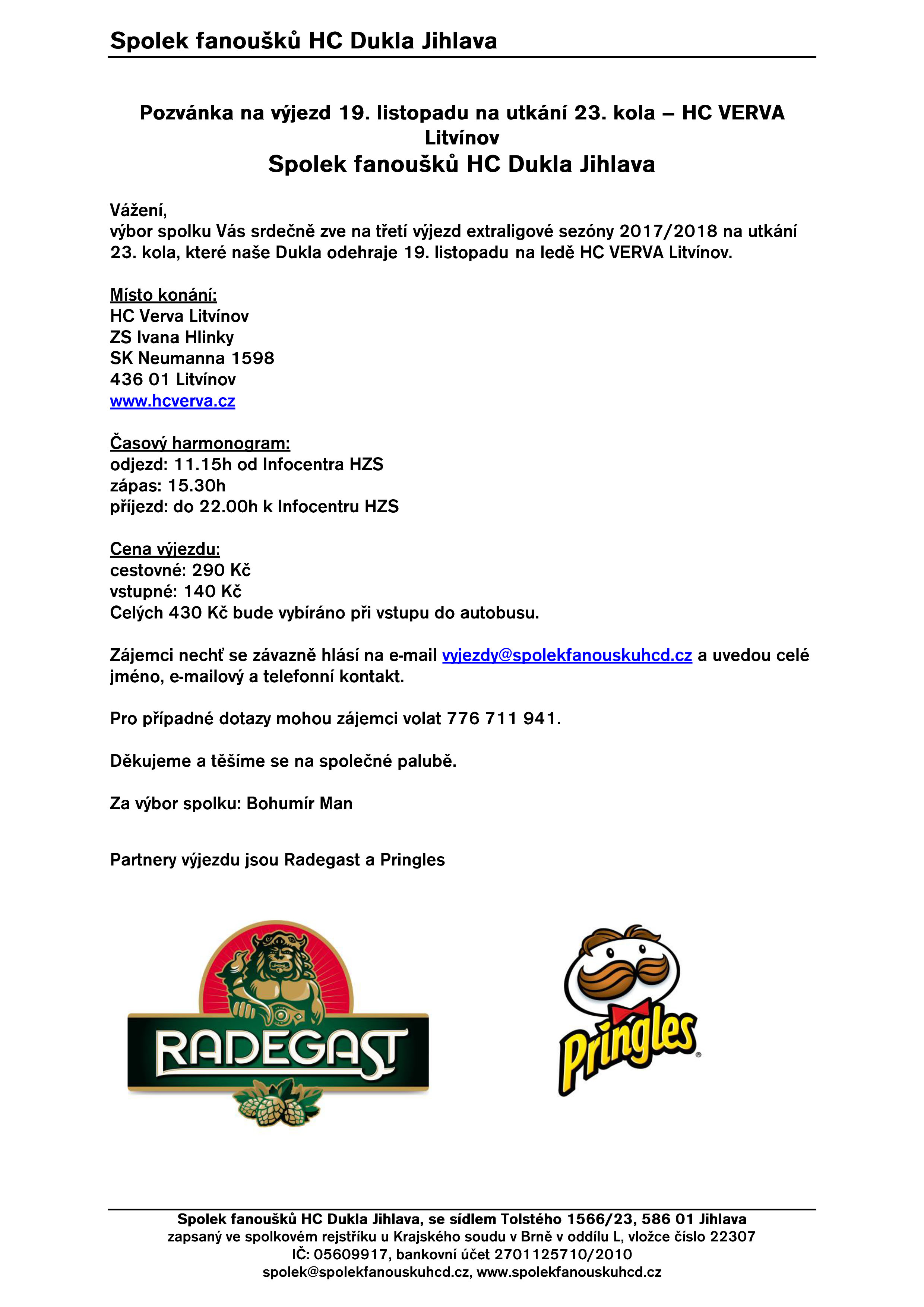 Výhra za dva body ve Zlíně, následně tříbodové vítězství ve Vítkovicích. Dukla v letošní sezoně dlouho čekala na vítězný venkovní zápas, aby poté vyhrála dvakrát v řadě. Třetí úspěch venku bude chtít Dukla přidat v neděli 19. listopadu na ledě Litvínova a vy, fanoušci, jí můžete vyjádřit podporu přímo z hlediště Zimního stadionu Ivana Hlinky. Spolek fanoušků HC Dukla Jihlava totiž pořádá autobusový výjezd. Zájemci se mohou hlásit na e-mail vyjezdy@spolekfanouskuhcd.cz a bližší informace k výjezdu najdete v tomto článku níže.