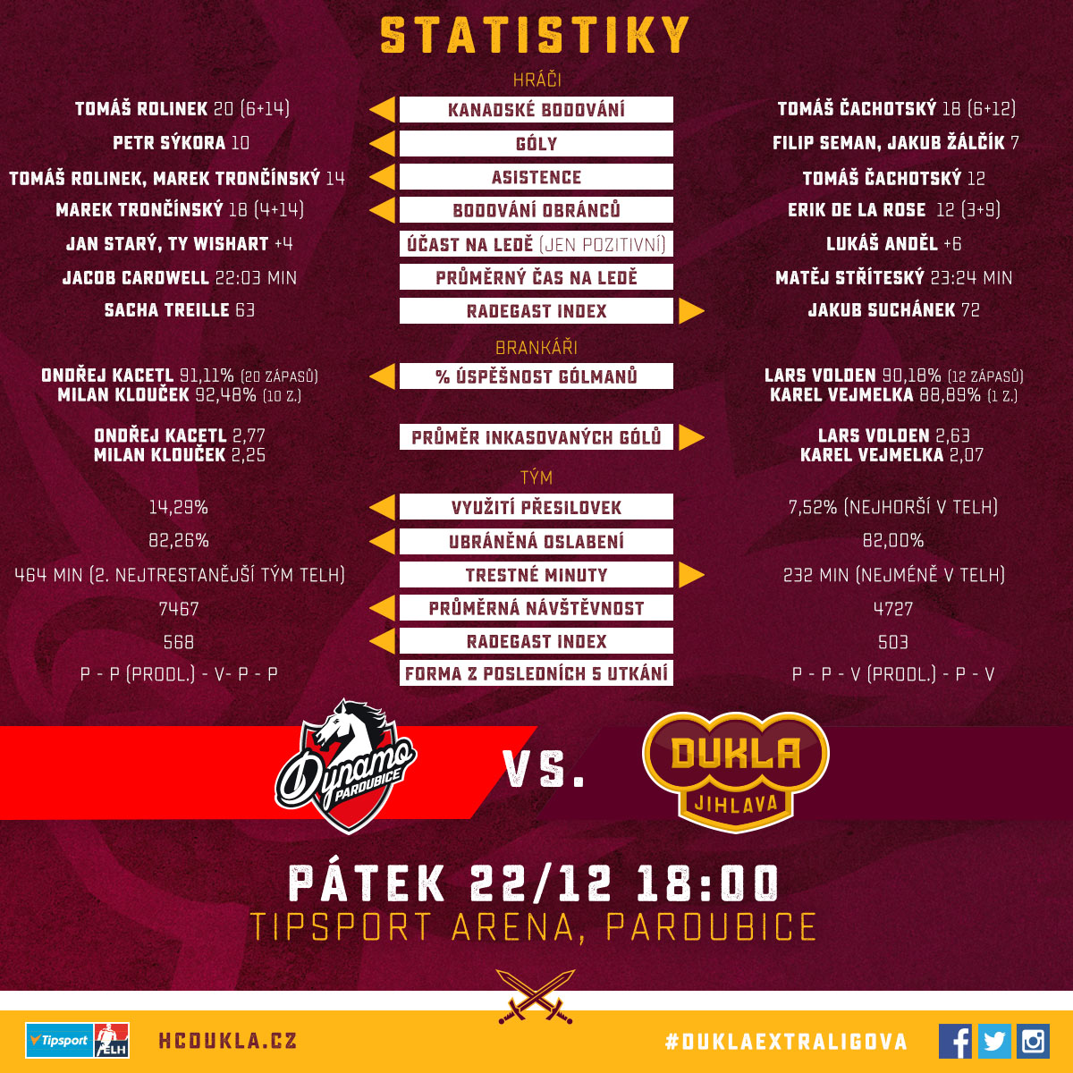 I přesto ale tým z východu Čech nenaplňuje očekávání fanoušků a pohybuje se na hraně desítky. Od posledního vzájemného utkání proti Jihlavě na počátku listopadu ale povstal jako bájný Fénix a ze sedmi zápasů šestkrát bodoval, dokázal například obrat Kometu na jejím ledě o dva body, Třinec venku o bod a na domácím ledě ve velmi vypjatém derby, zejména díky návratu Petra Koukala v hradeckém dresu na led, přetlačit sousední Hradec Králové 3:2. V prosinci jakoby se ale otočily karty a Dynamo si odvezlo body pouze dvakrát z pěti utkání. Doma porazilo Chomutov 5:2 a na ledě Boleslavi vyválčila bod po prohře 2:3 v prodloužení. Především pak díky výše zmíněné sérii jsou nyní Dynamáci desátí s 39 body, díky nejlepšímu skóre vévodí trojici se stejným počtem bodů, pod nimi je Chomutov a Liberec. Naopak Pardubice ztrácí bod na Spartu a dva na Mladou Boleslav.