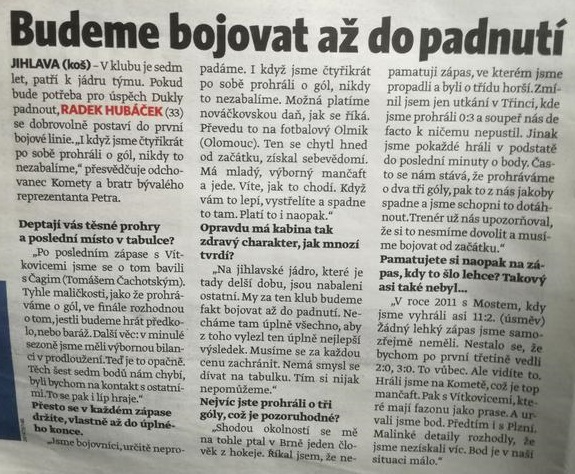 Jihlavští svého soupeře jasně přestříleli. Ve druhé třetině byl poměr střel 15:8 pro Jihlavu a červenožlutí z toho vytěžili zásluhou Adama Zemana vyrovnání. Celkem Dukla na střely vyhrála 31:23, ale… „Koncovka nás sužuje delší dobu. Ale my se nemůžeme donekonečna vymlouvat na to, jestli máme nebo nemáme horší koncovku. Kola plynou a my těch bodů pořád moc neděláme. Není prostor na to kličkovat nebo se vymlouvat, je třeba začít dělat body,“ hlásí upřímně táborský rodák.