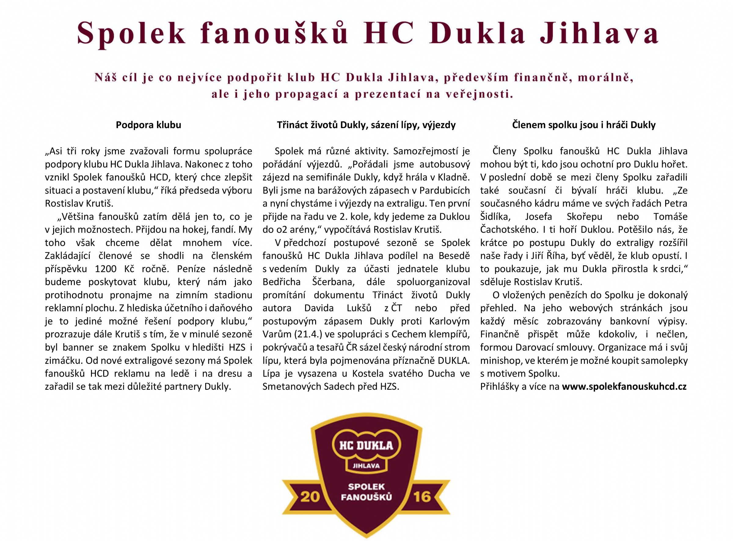 Spolek fanoušků HC Dukla Jihlava přijal za první rok existence 220 členů - přihlásit se můžete zde. Mezi nimi současní i bývalí hokejisté A-týmu. Krátce po postupu Dukly do extraligy vstoupil do Spolku obránce Jiří Říha (od nové sezony Mladá Boleslav), poté také Petr Šidlík, Josef Skořepa, Tomáš Čachotský, Richard Diviš a Filip Seman.