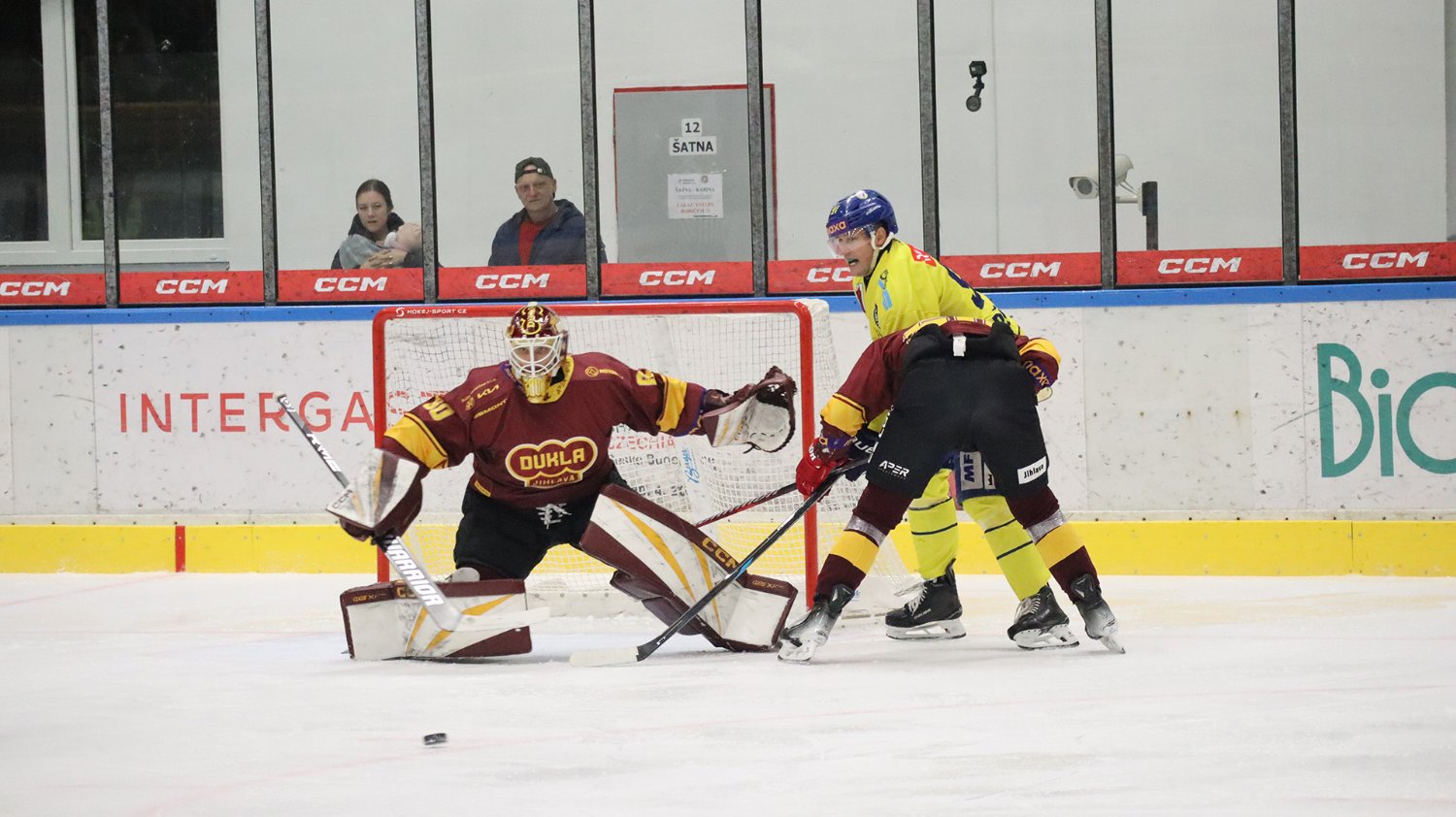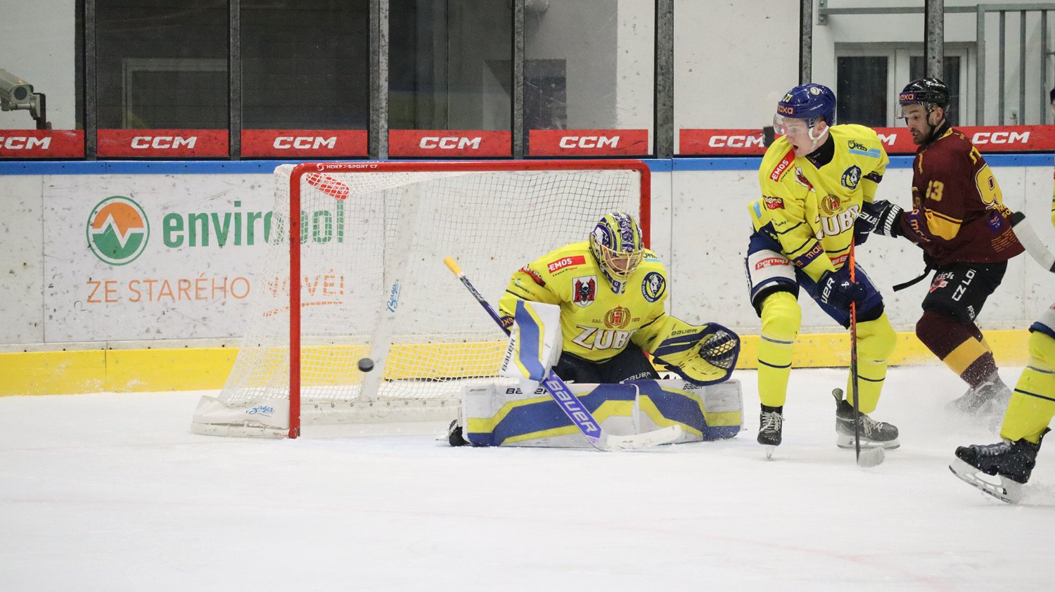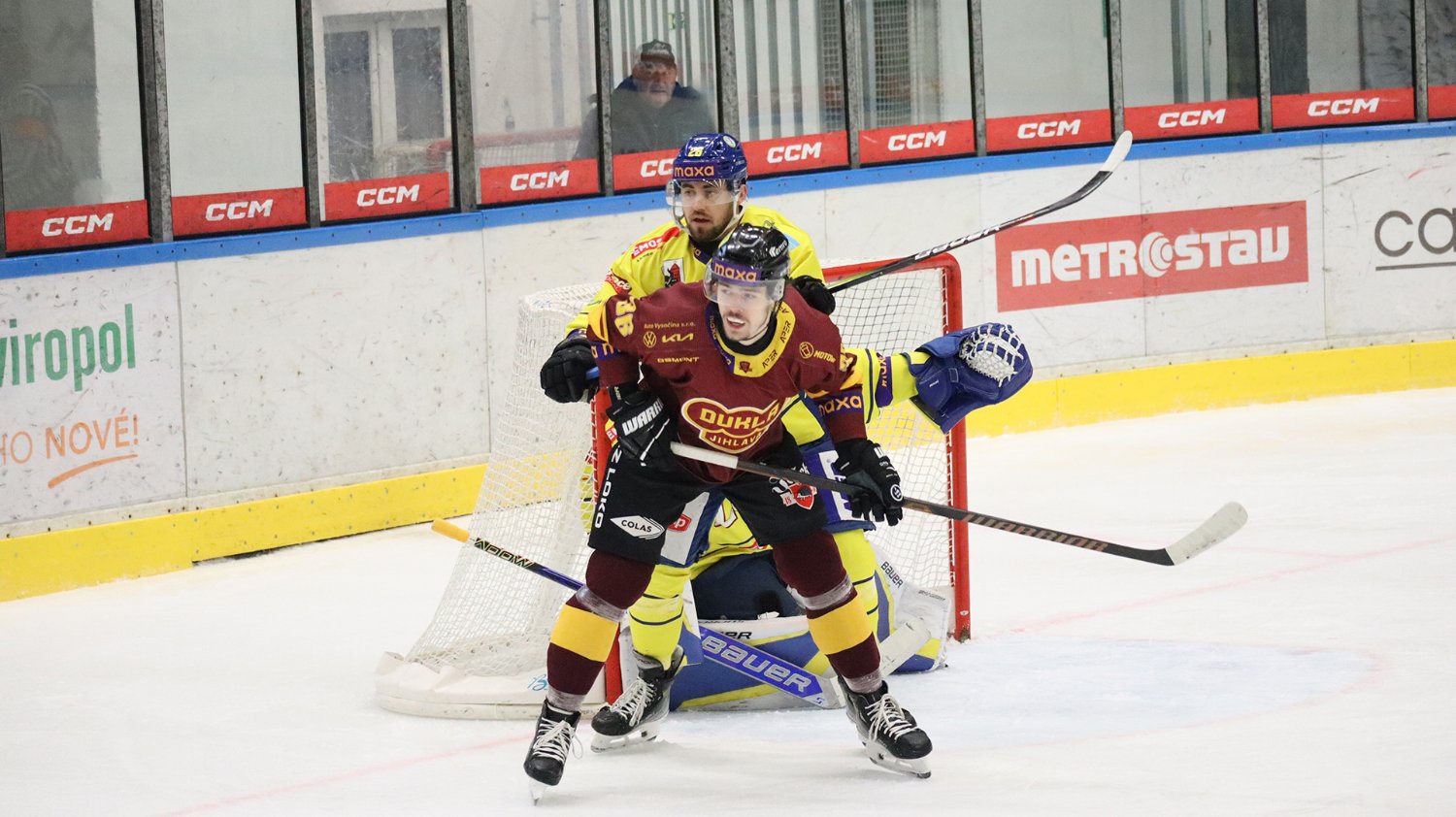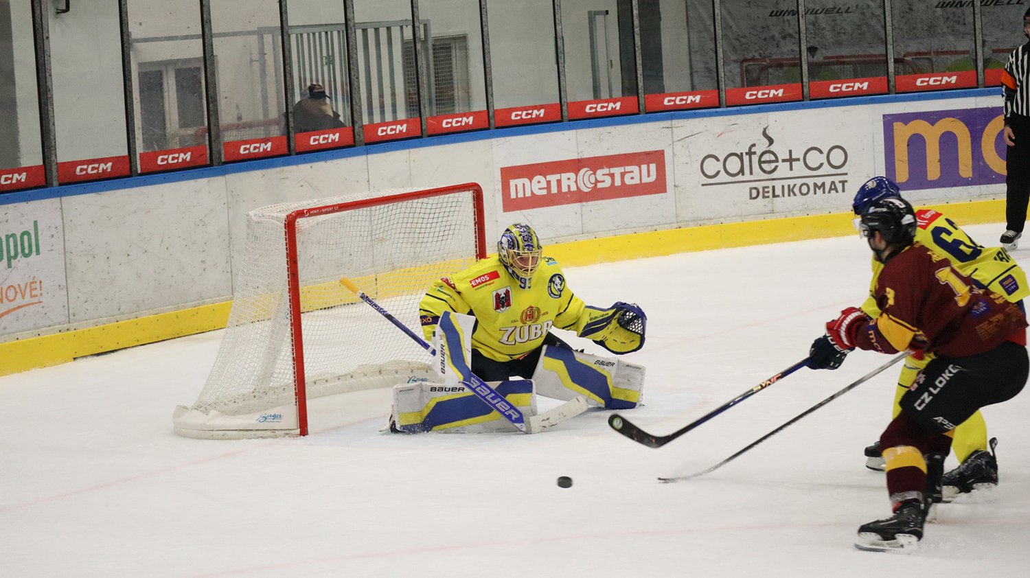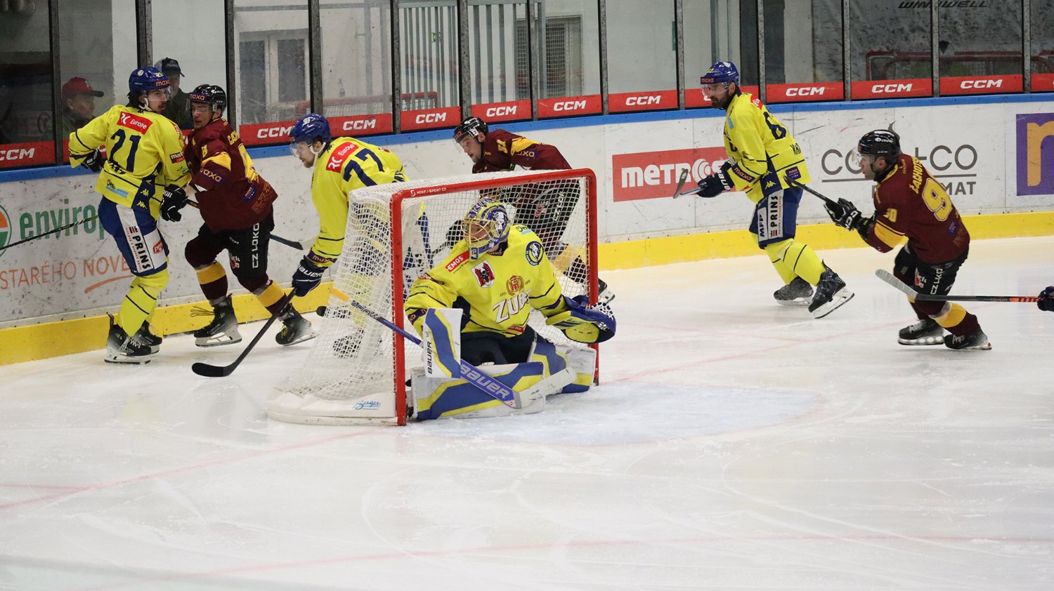 Tomáš Jáchym s číslem 77 za brankou bojuje o puk