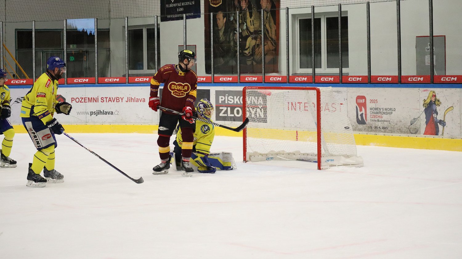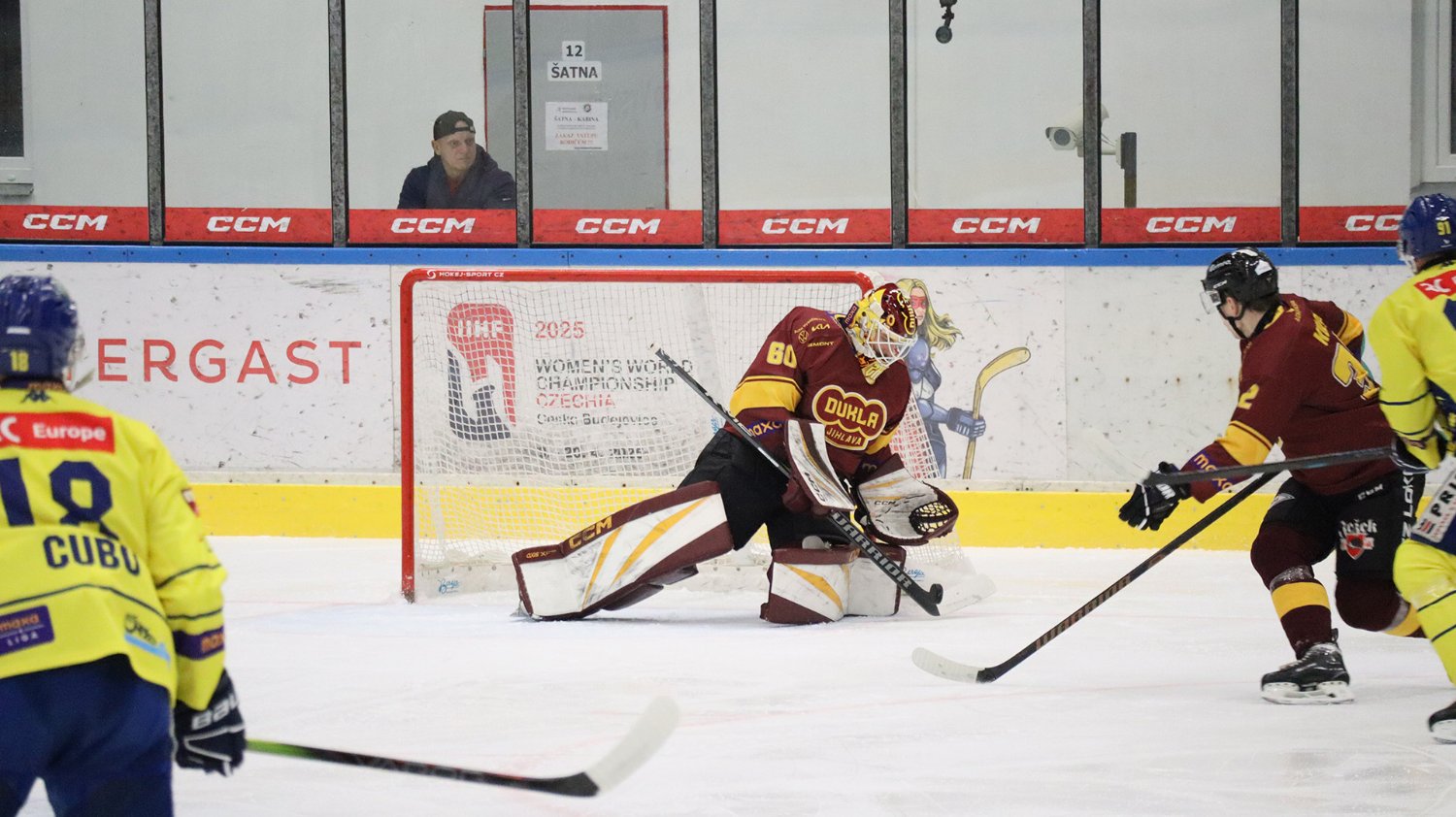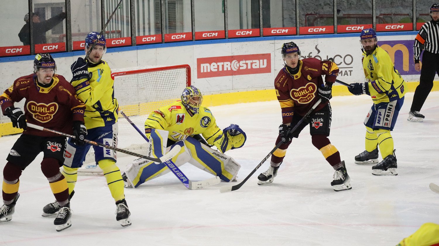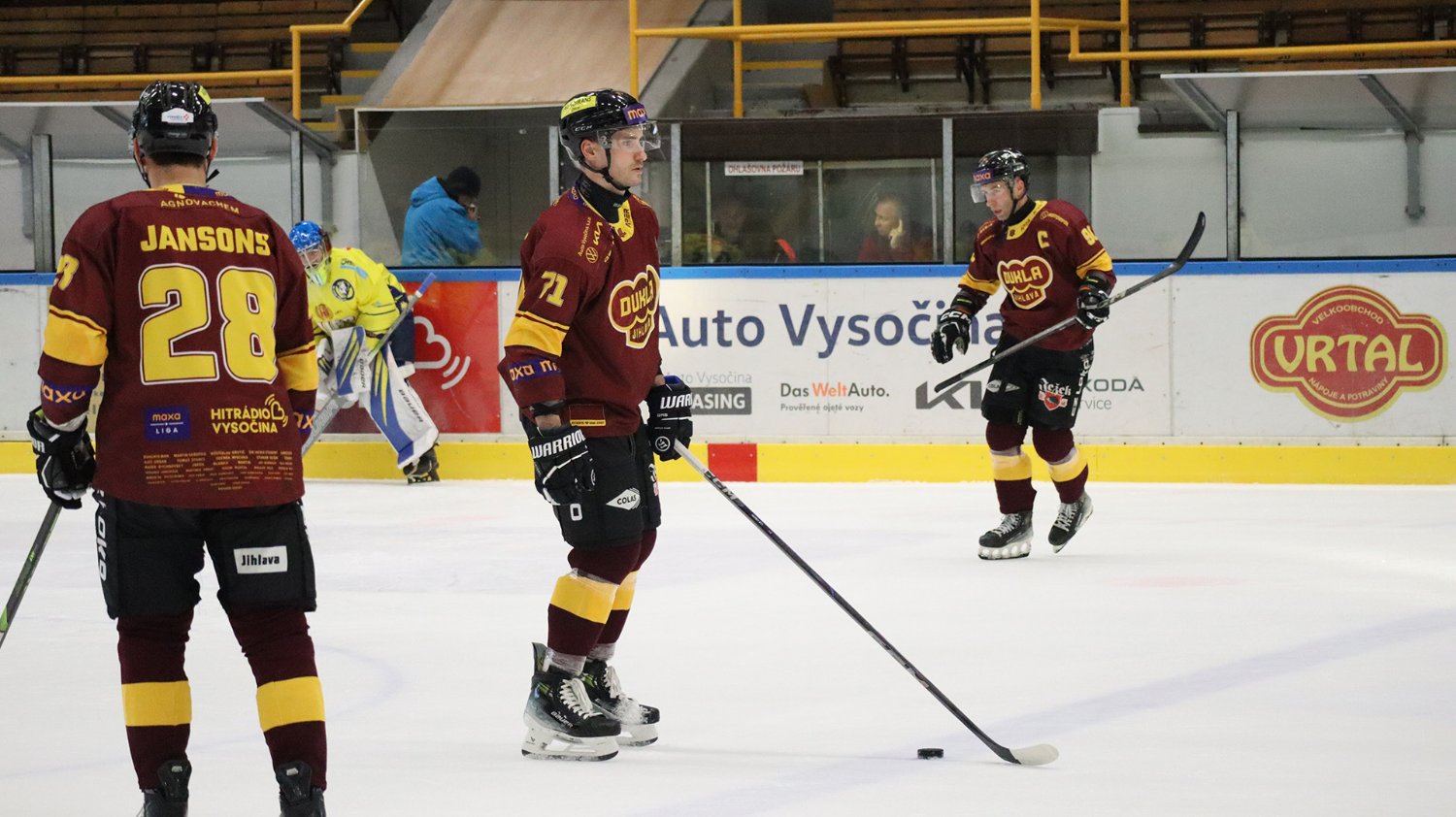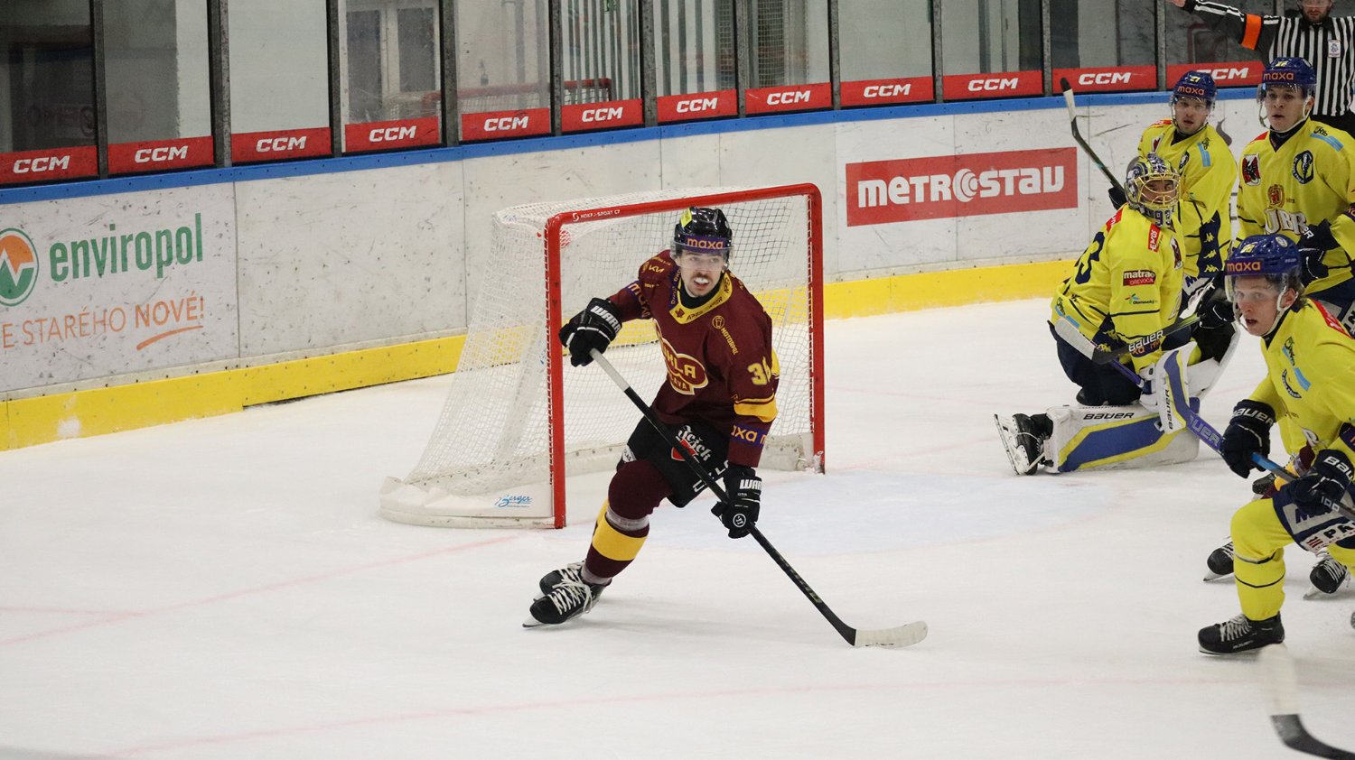Tomáš Jáchym s číslem 77 za brankou bojuje o puk