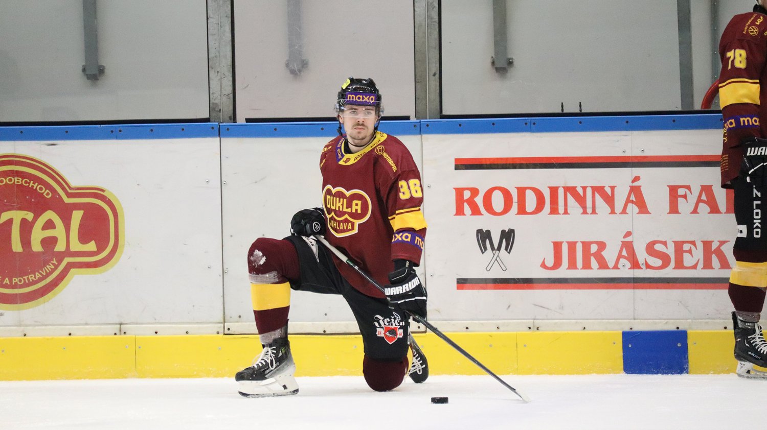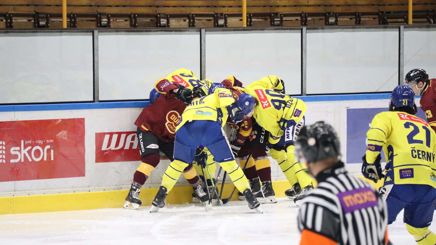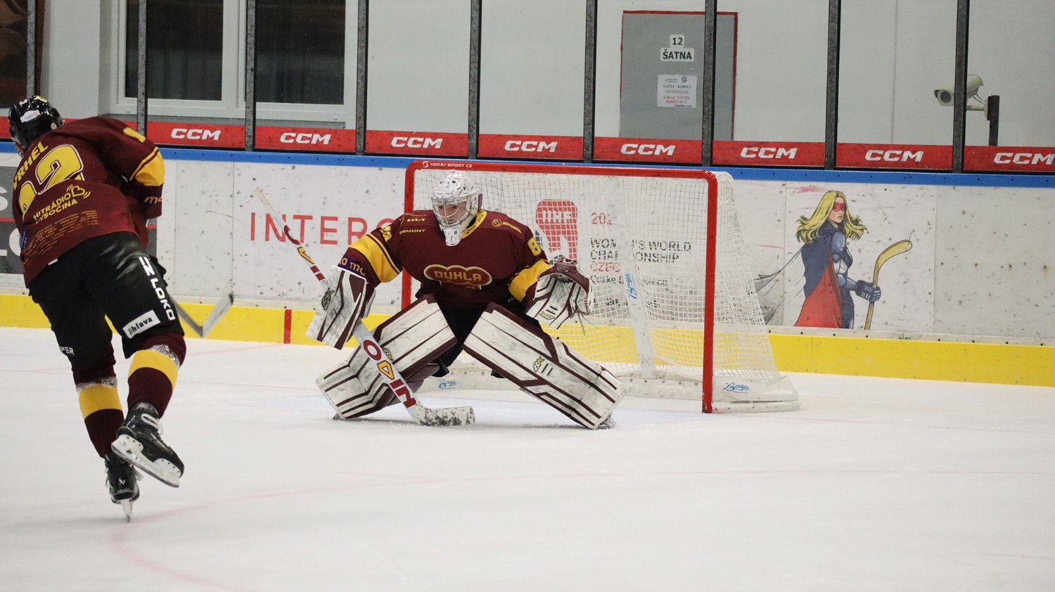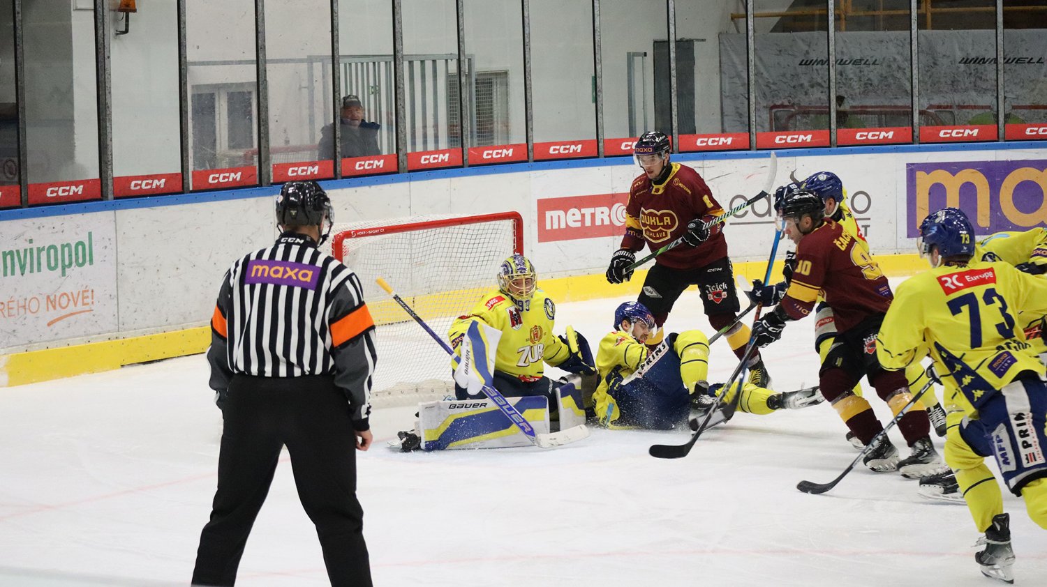 Tomáš Jáchym s číslem 77 za brankou bojuje o puk