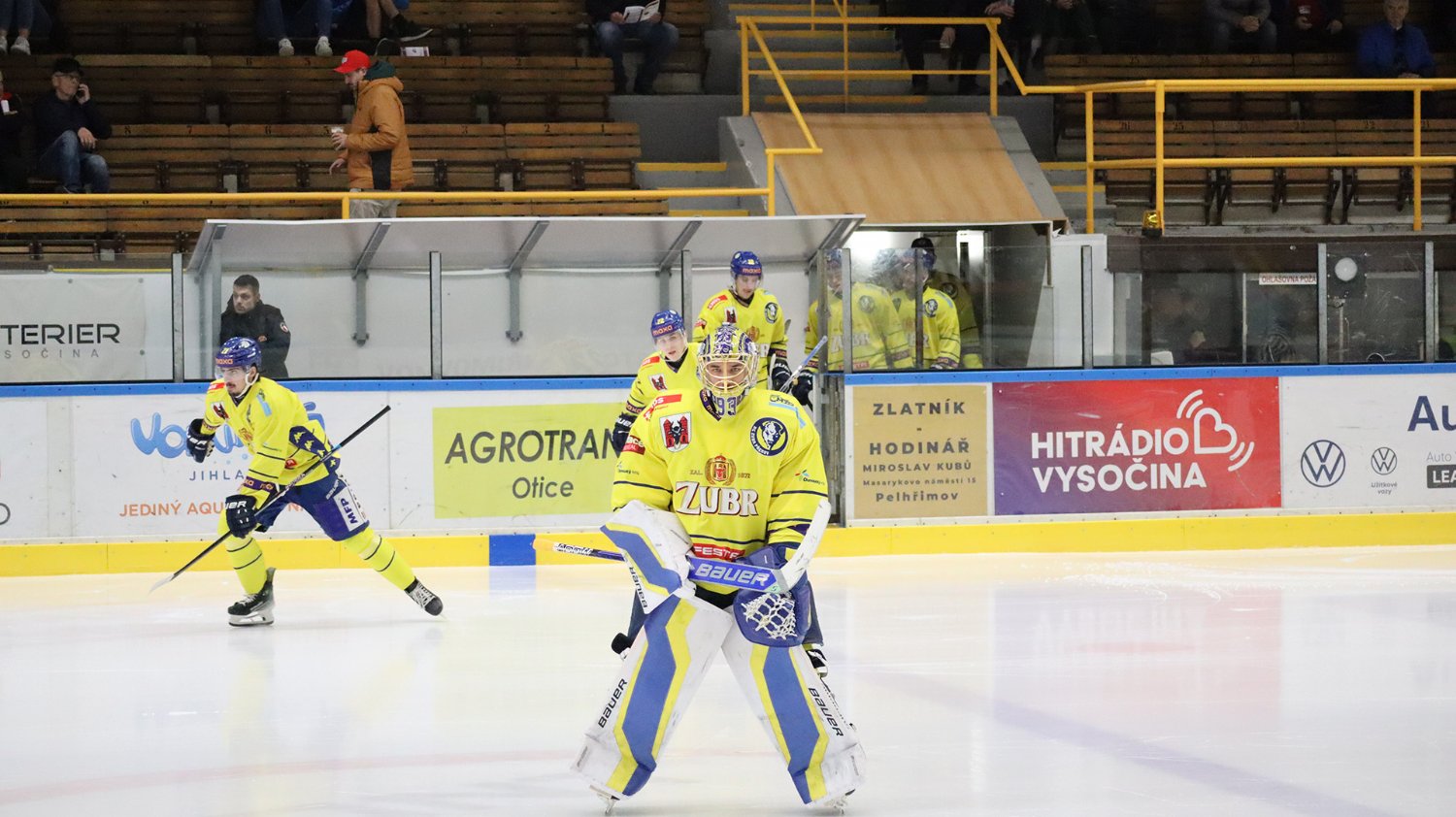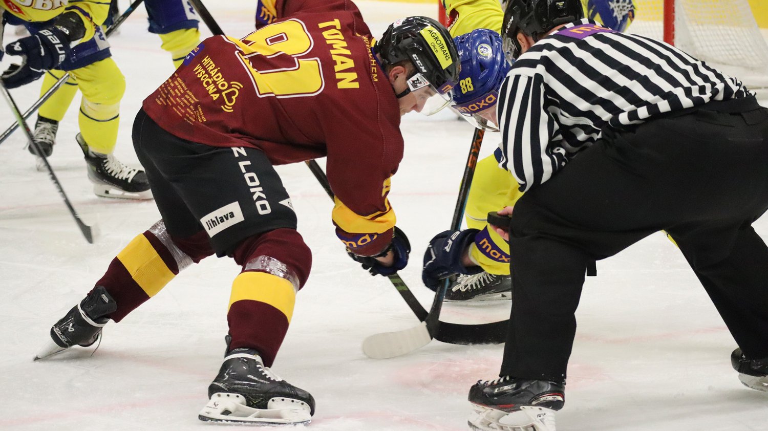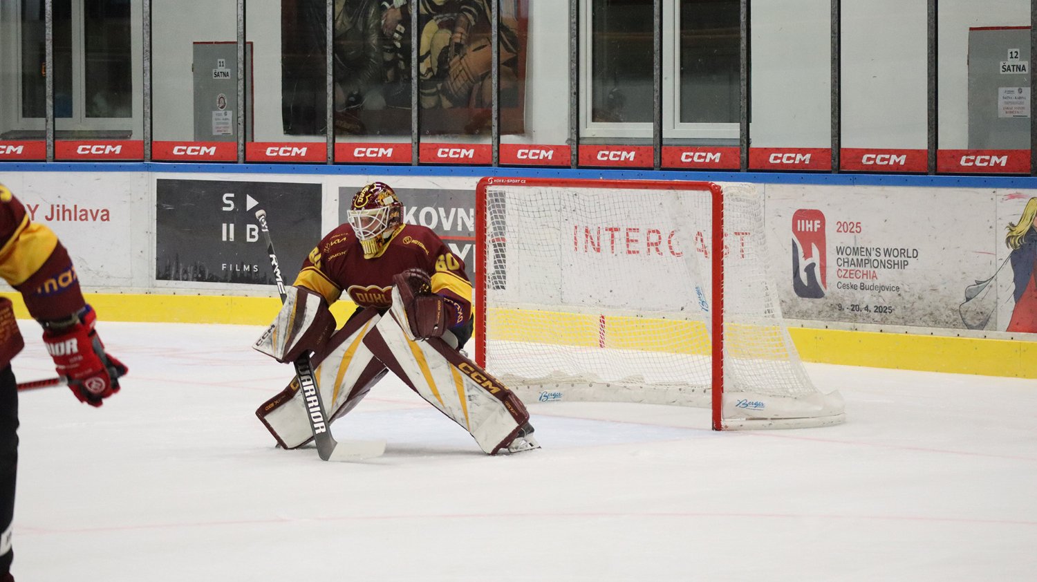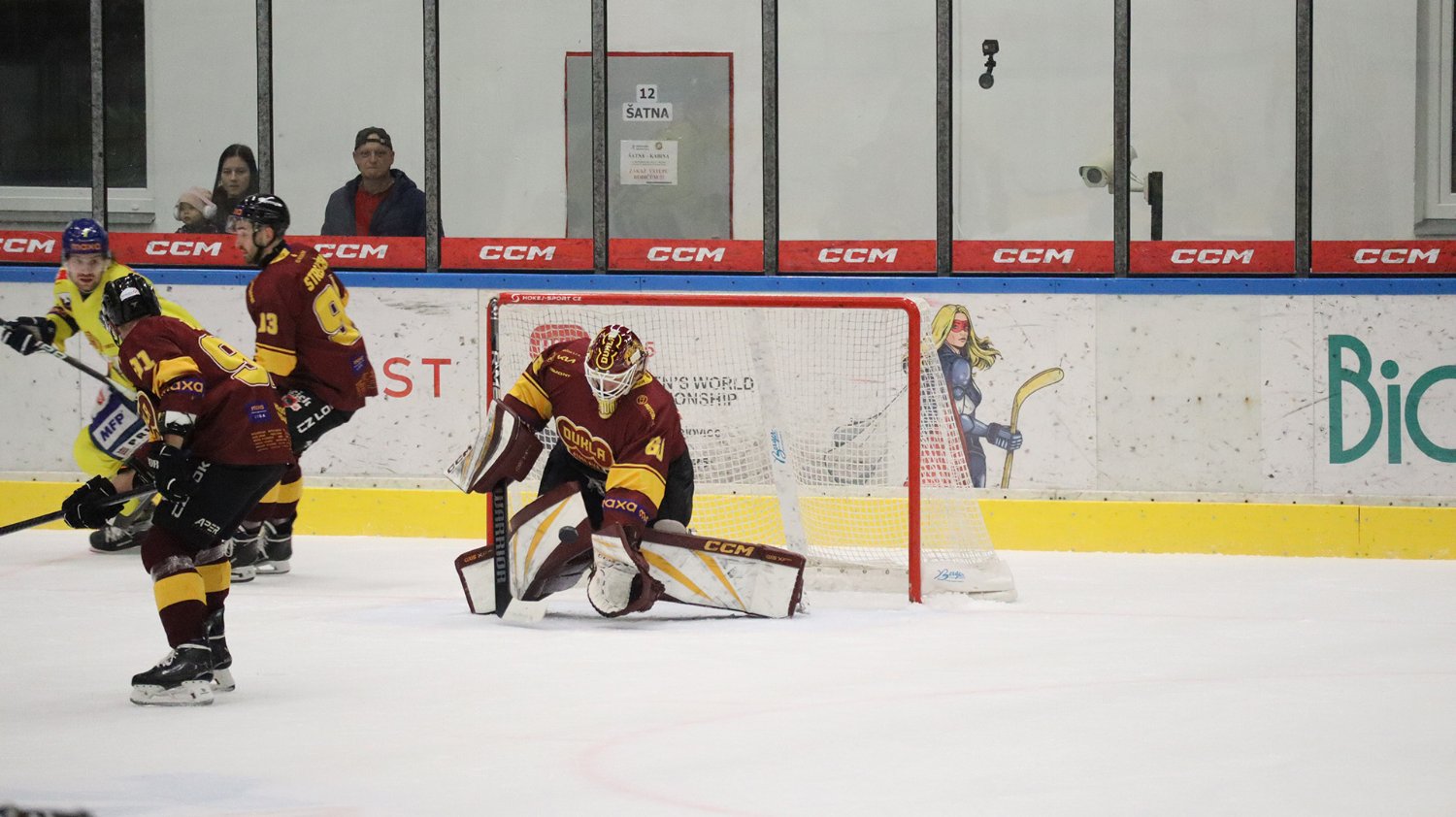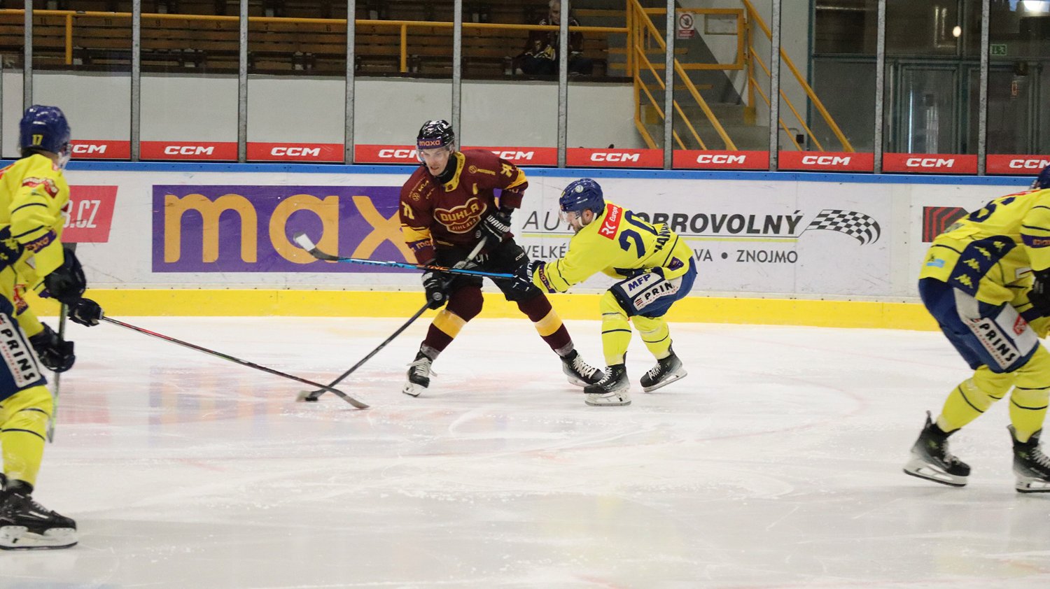 Tomáš Jáchym s číslem 77 za brankou bojuje o puk