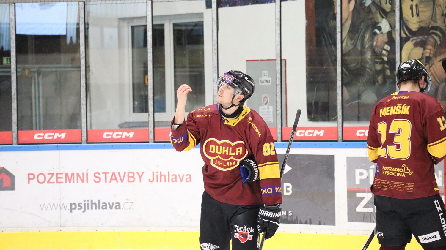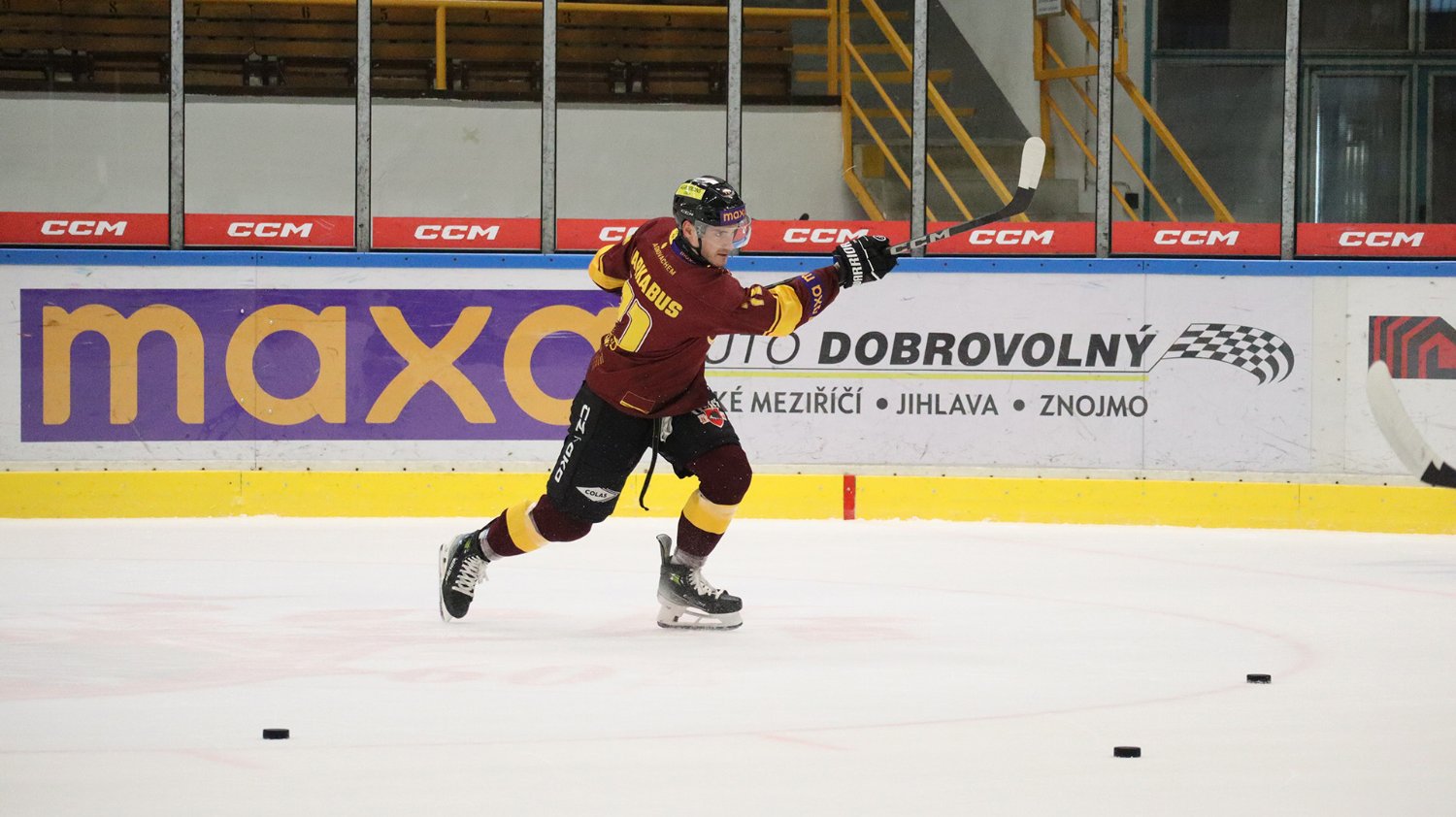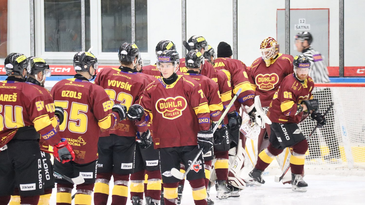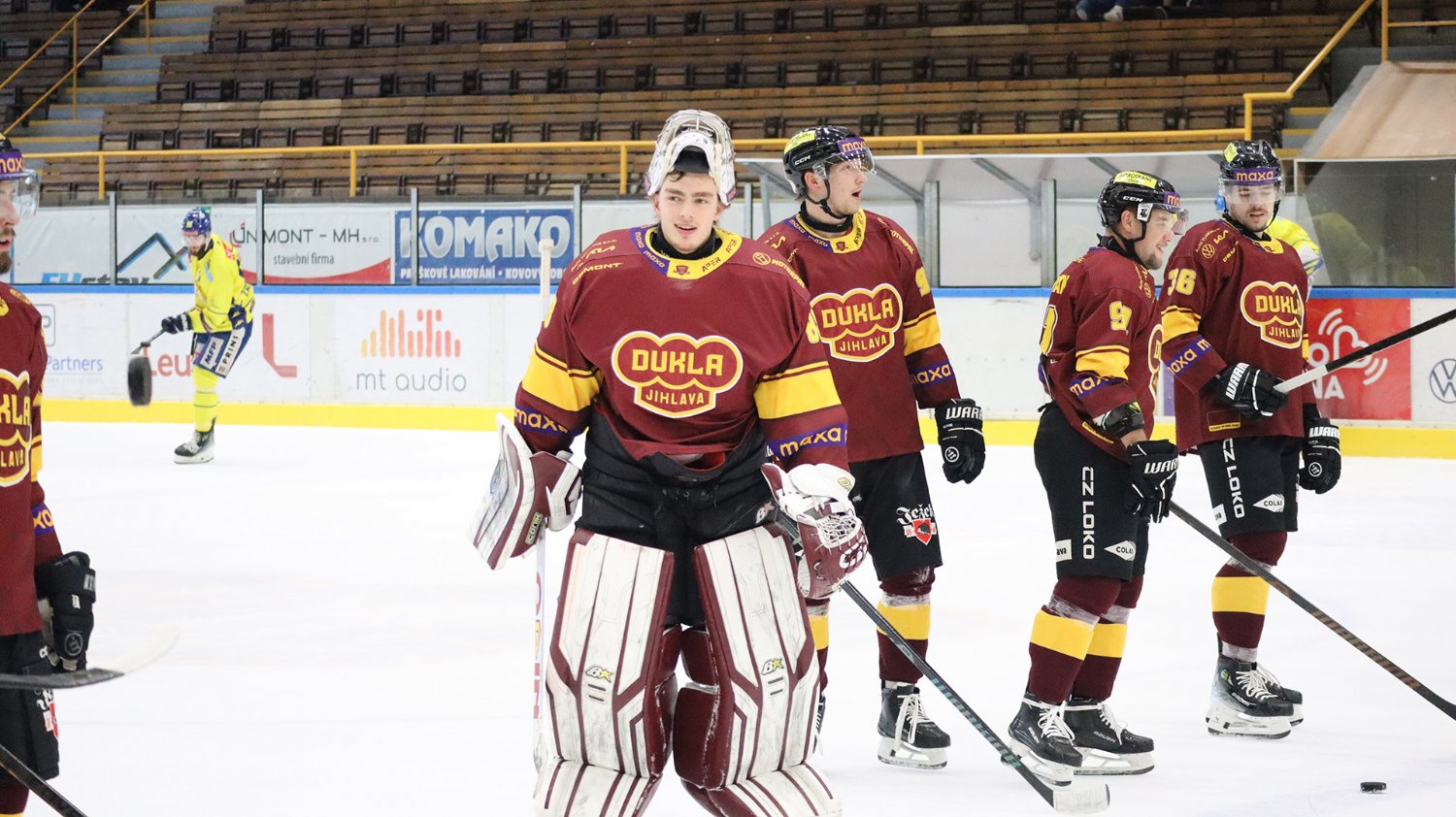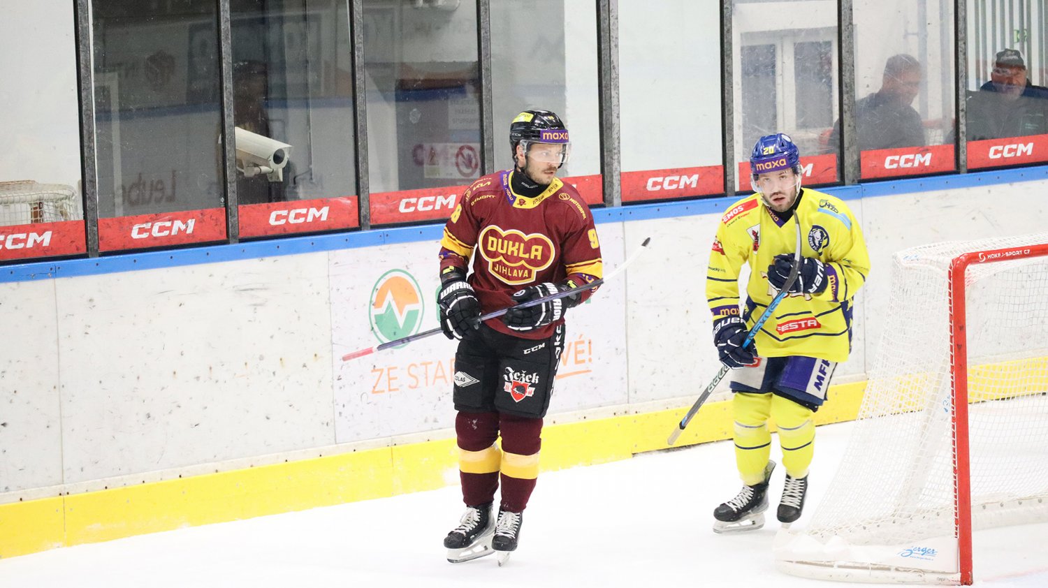 Tomáš Jáchym s číslem 77 za brankou bojuje o puk