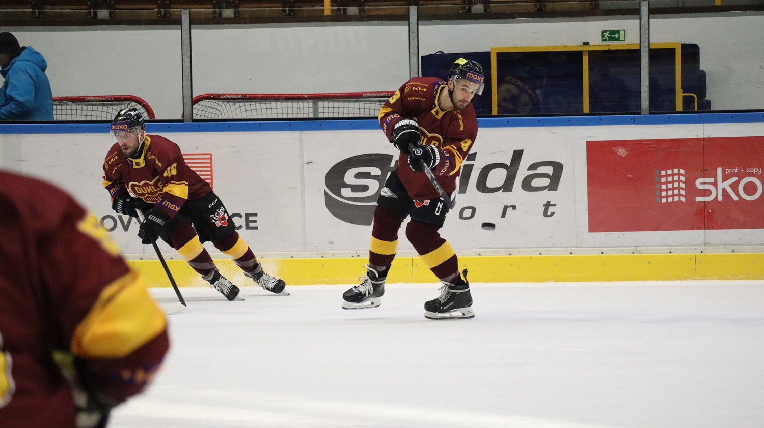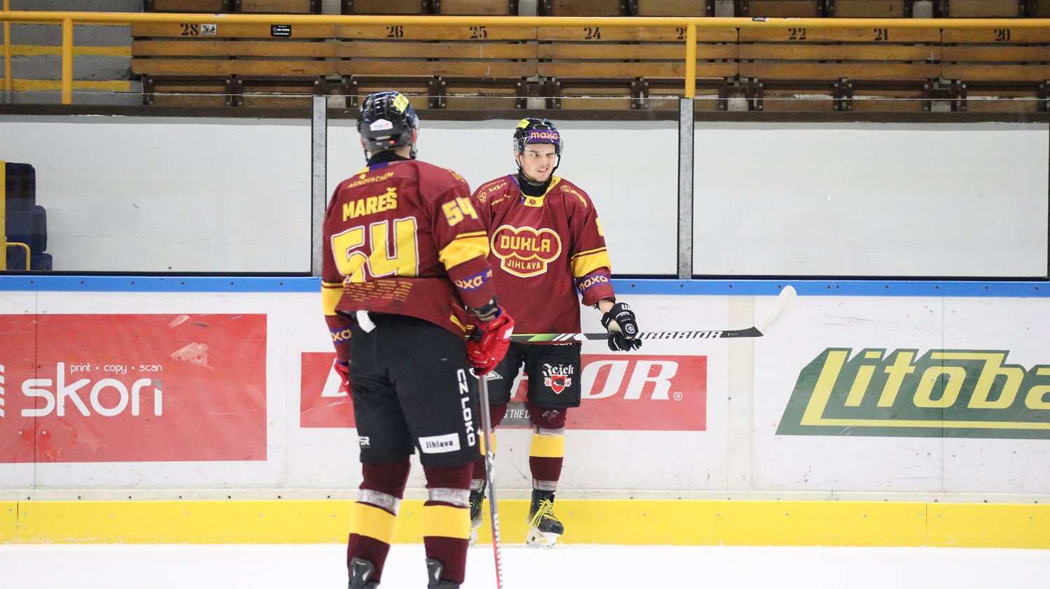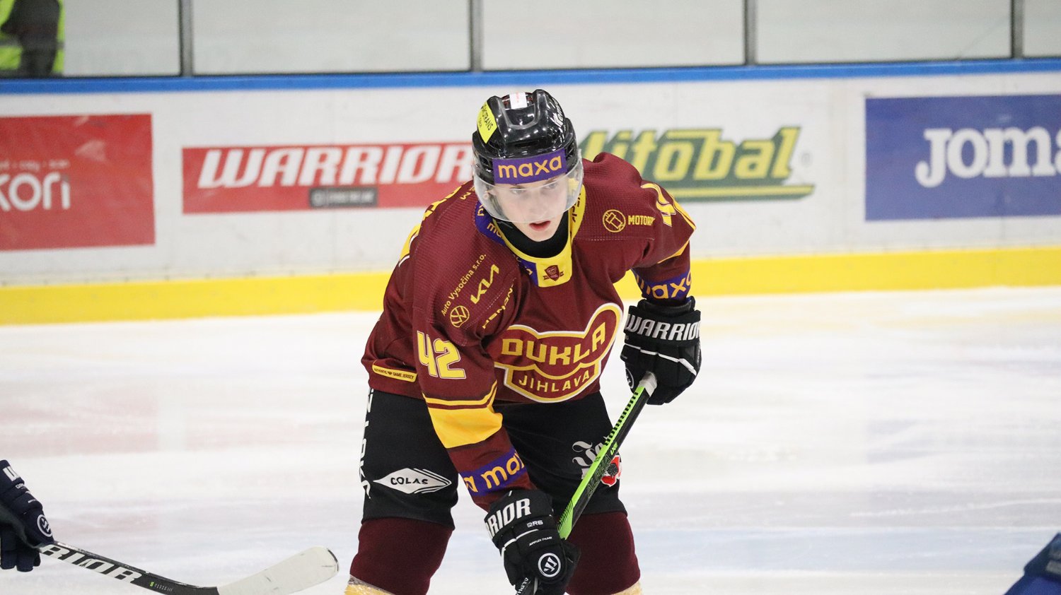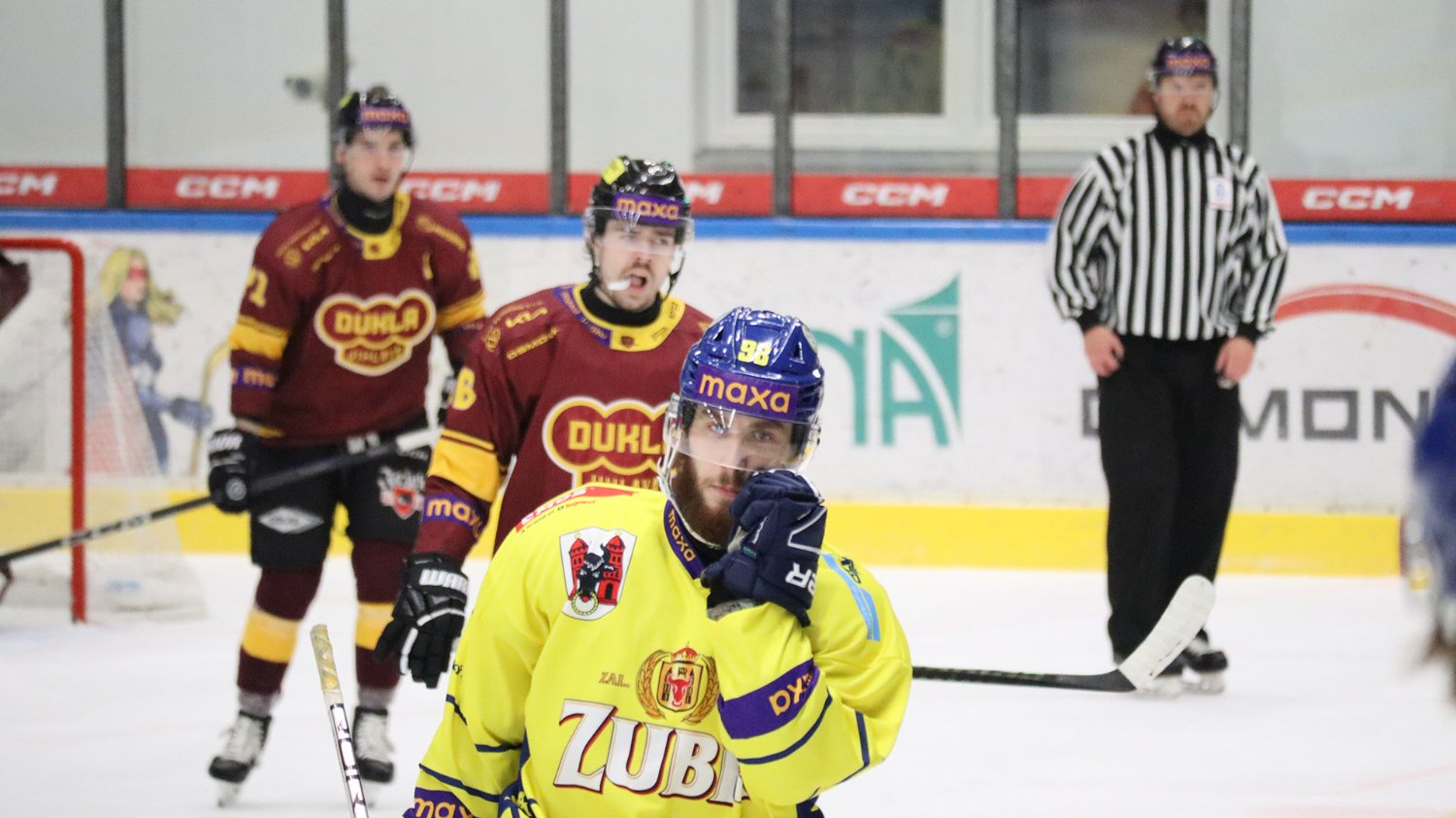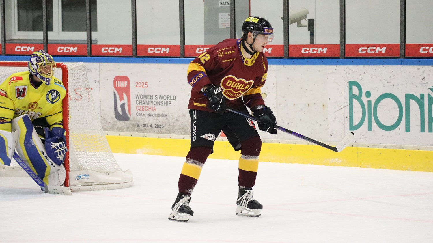 Tomáš Jáchym s číslem 77 za brankou bojuje o puk