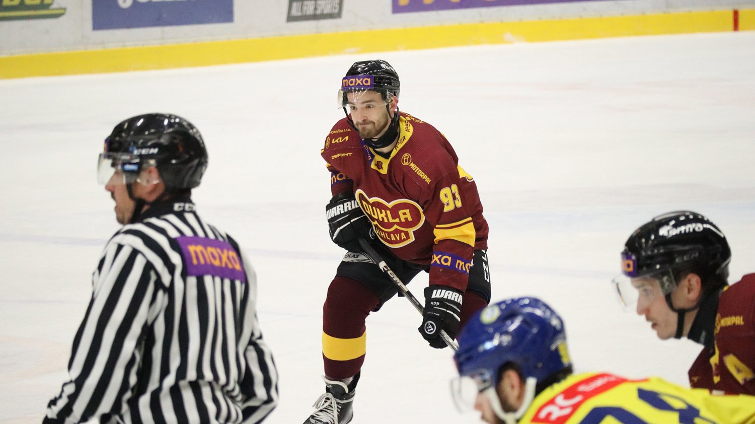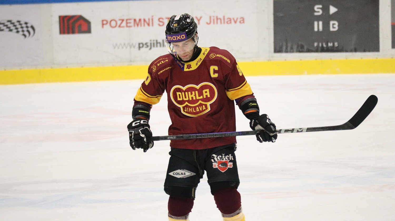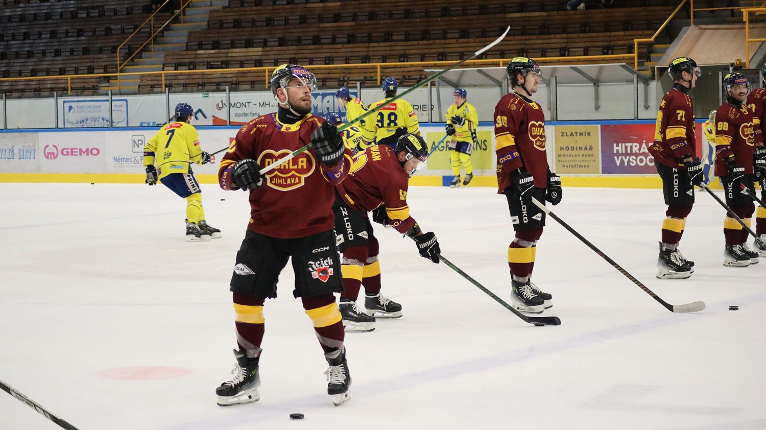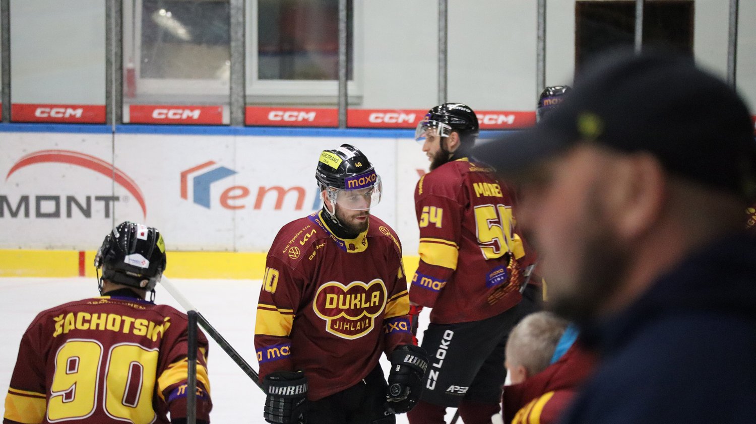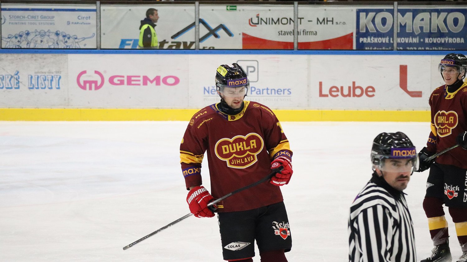 Tomáš Jáchym s číslem 77 za brankou bojuje o puk