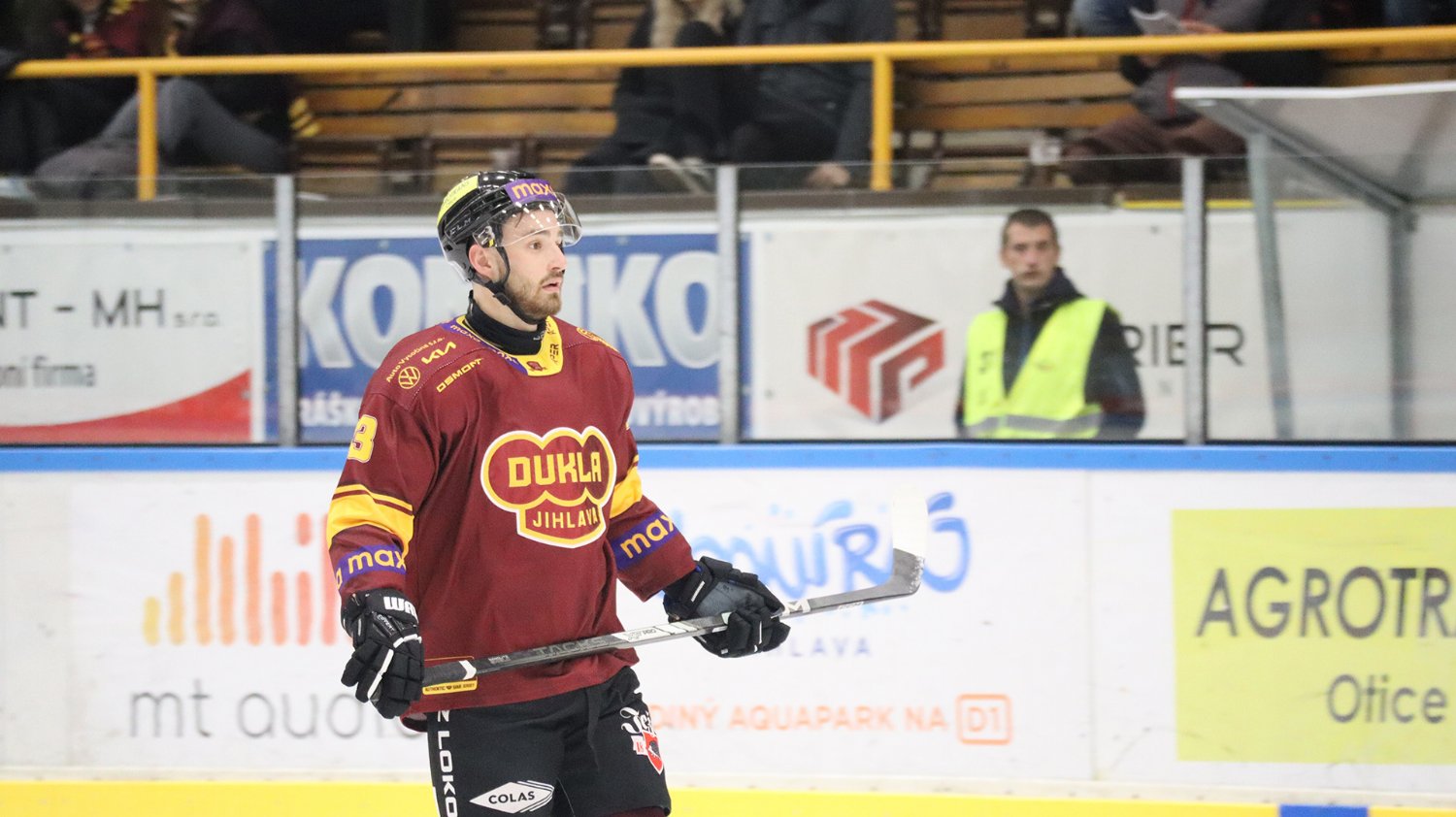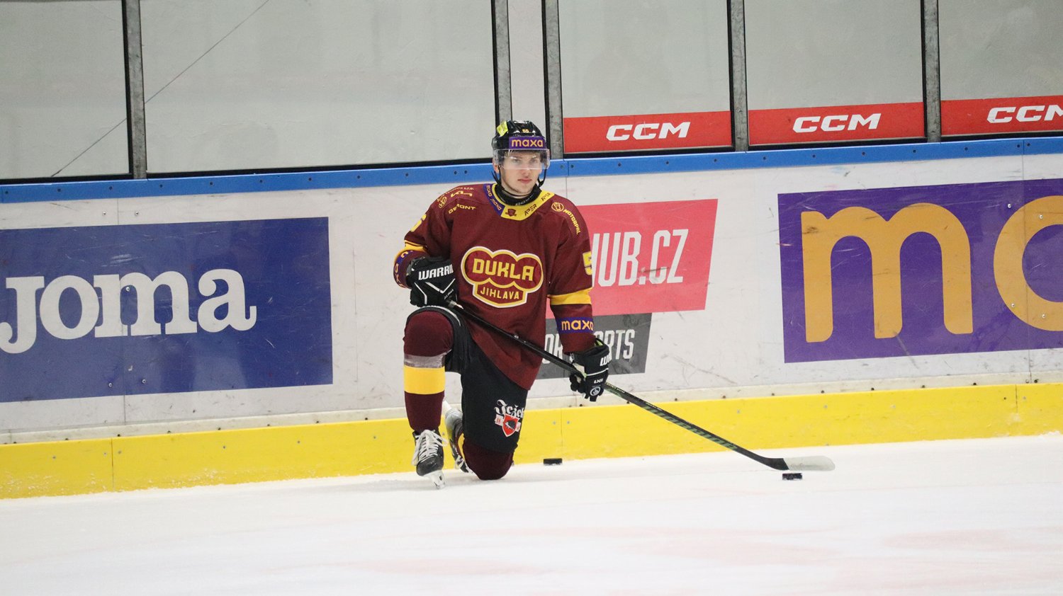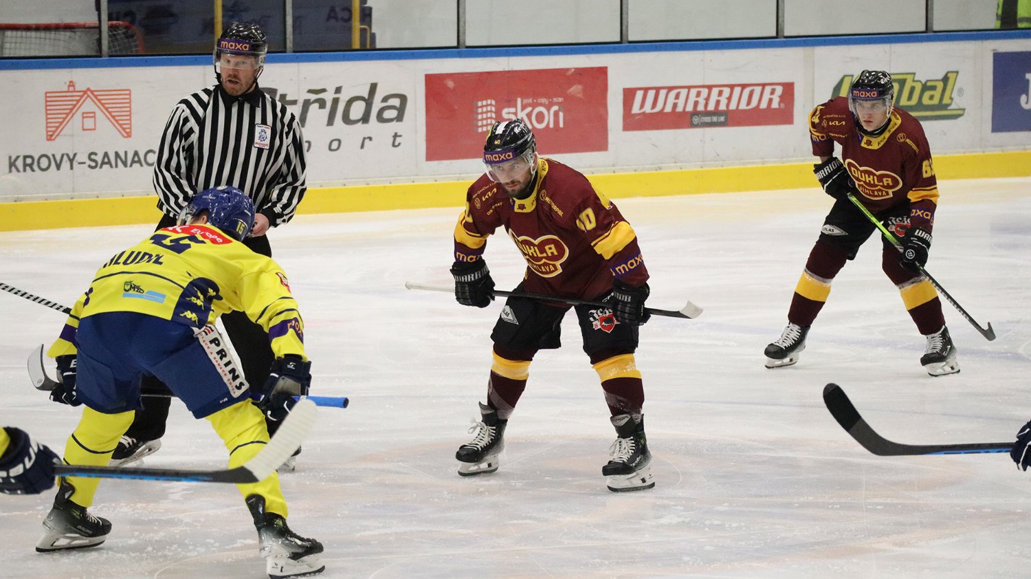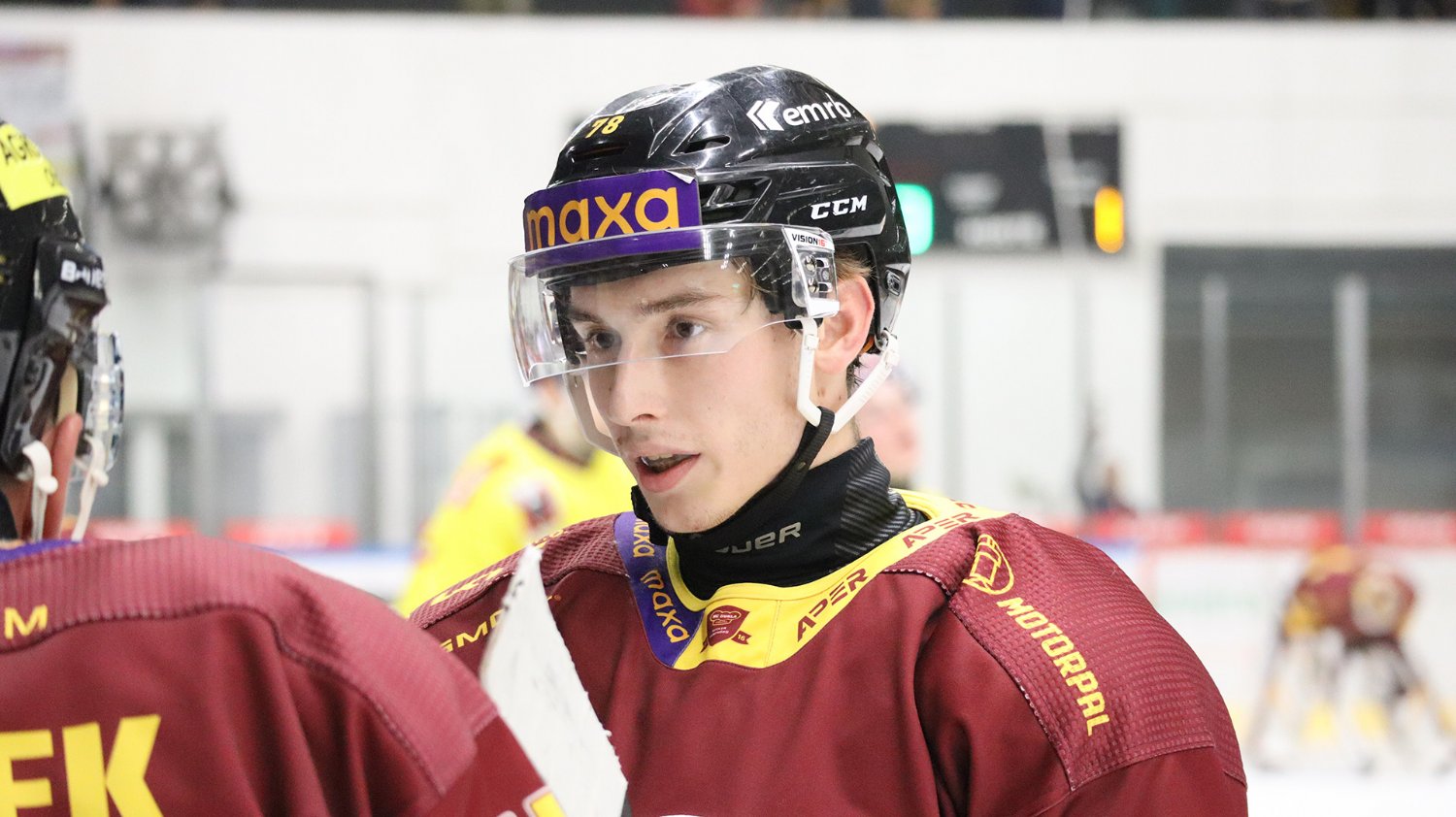 Tomáš Jáchym s číslem 77 za brankou bojuje o puk
