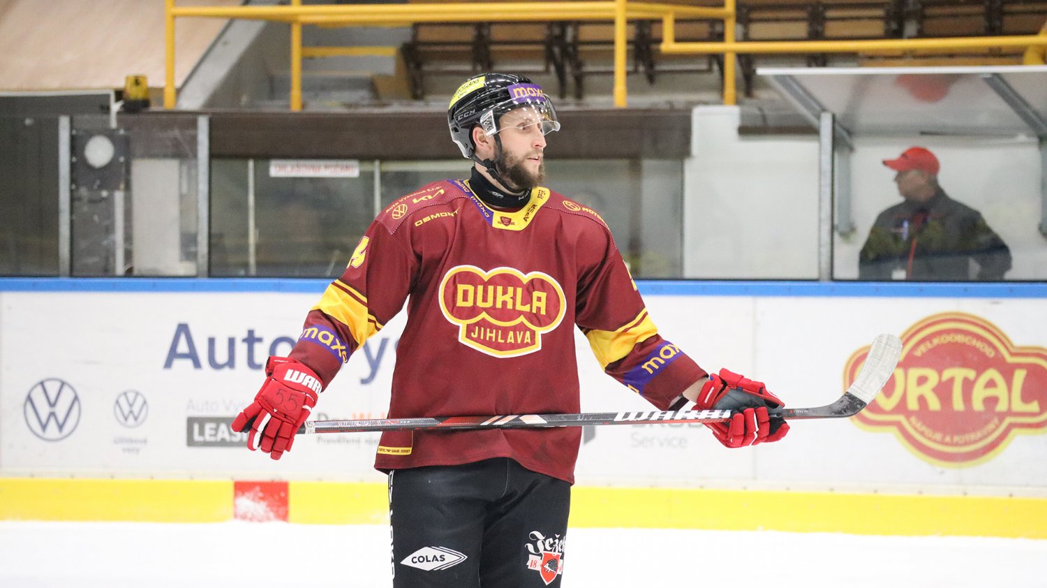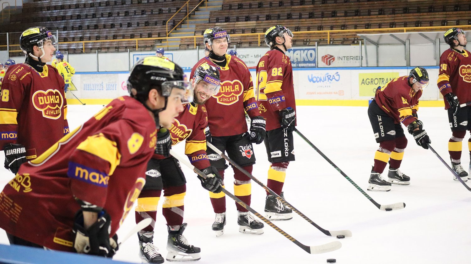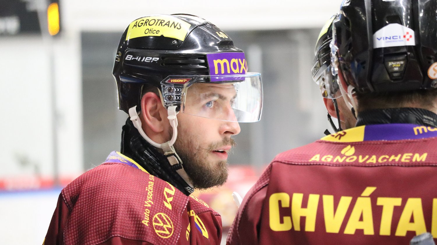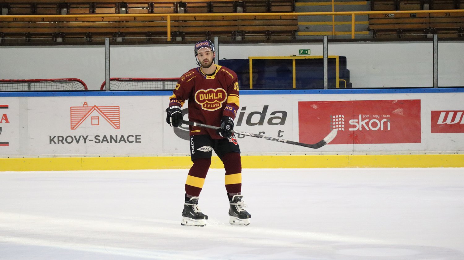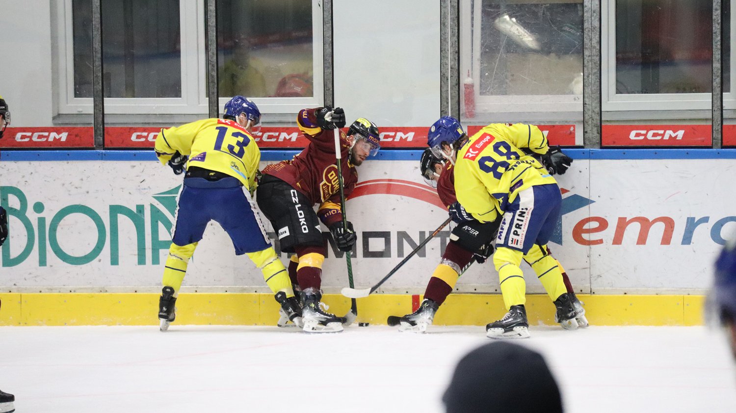 Tomáš Jáchym s číslem 77 za brankou bojuje o puk