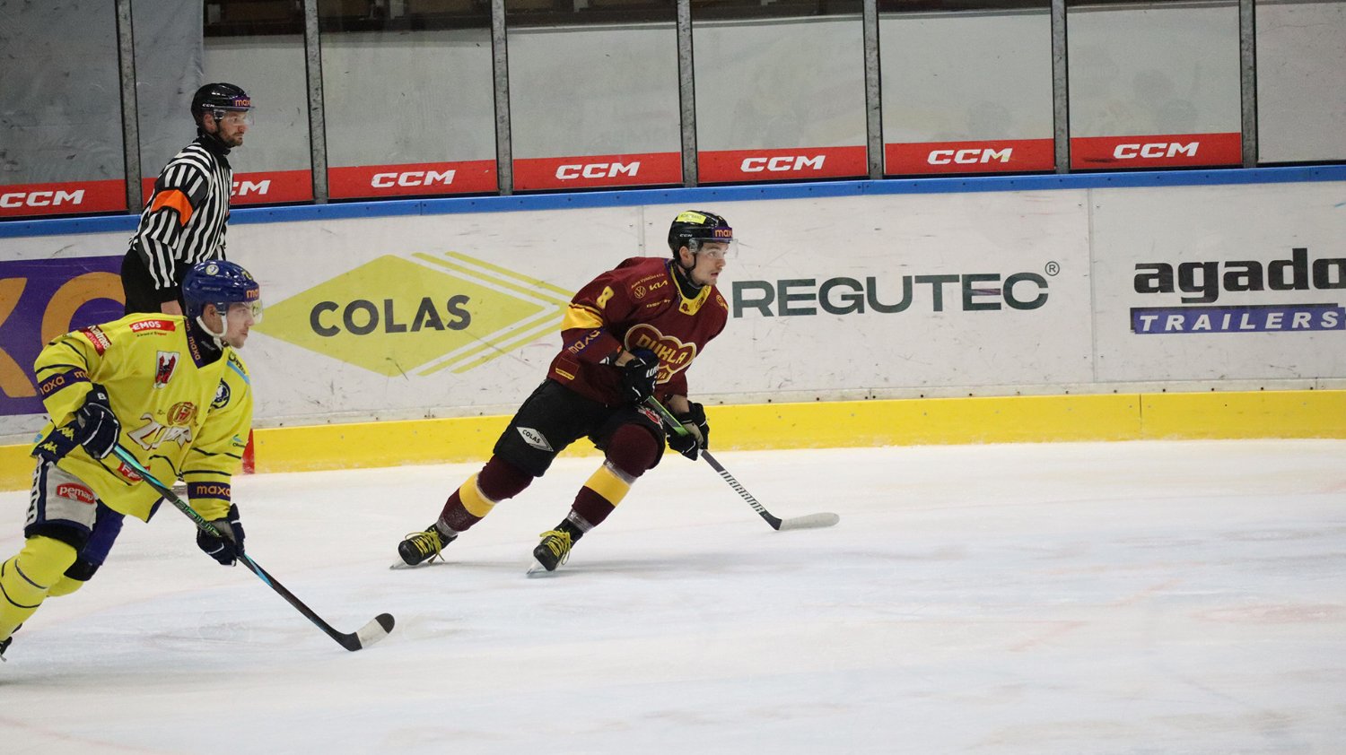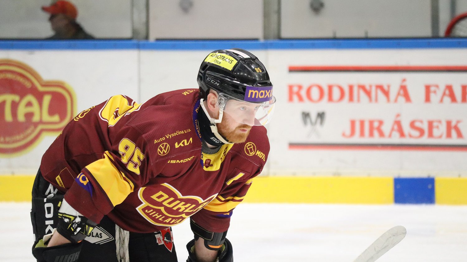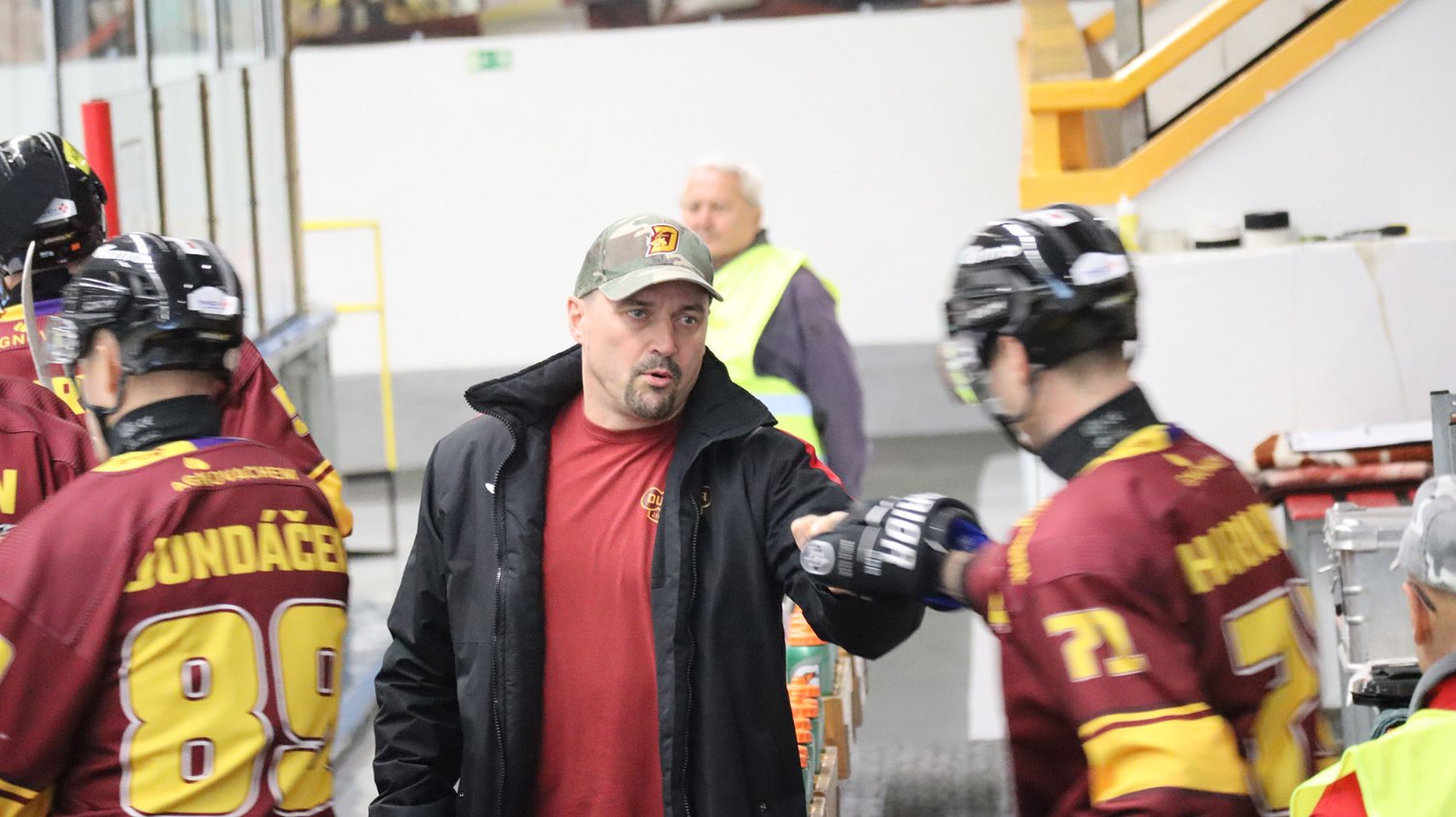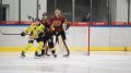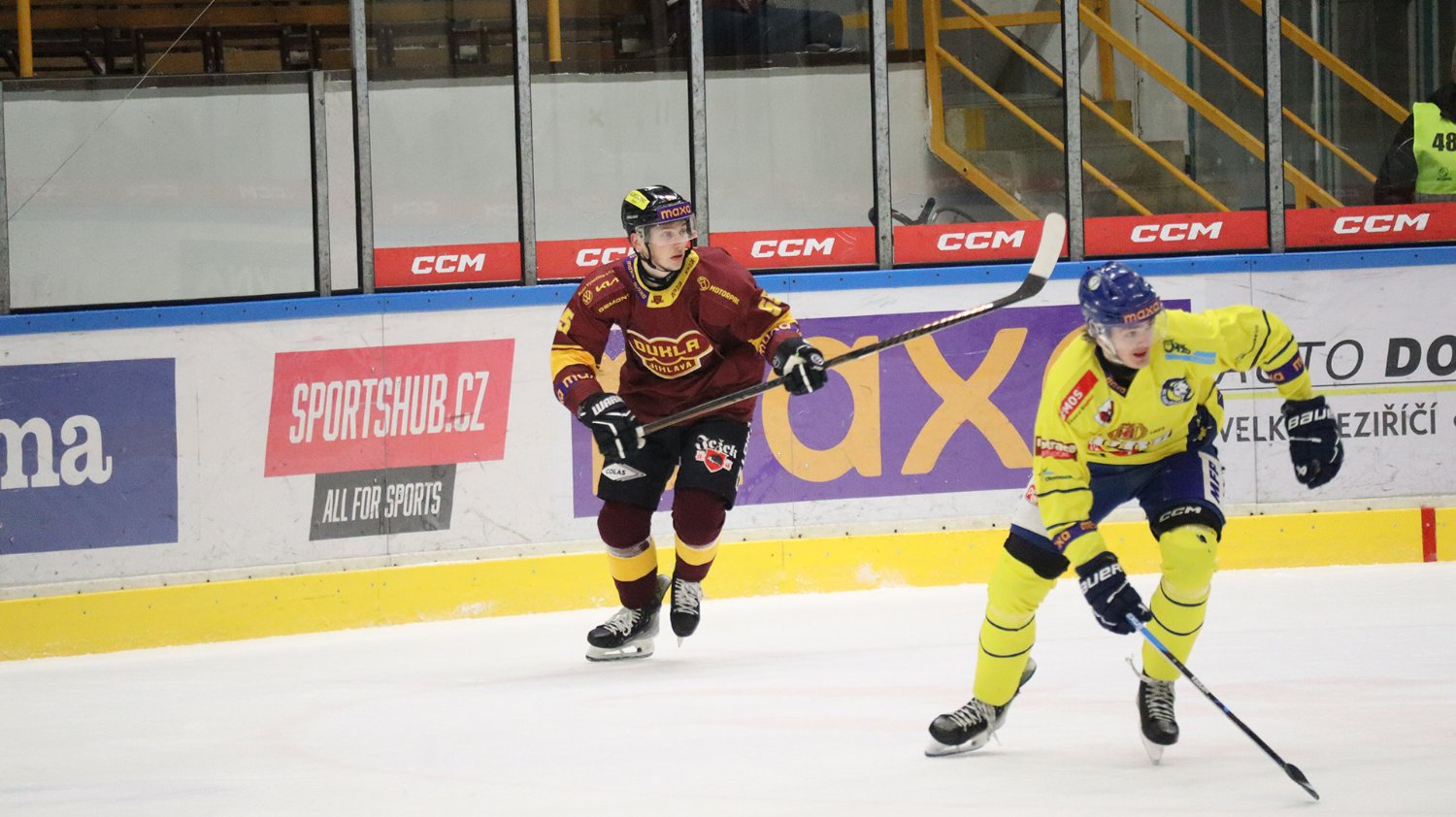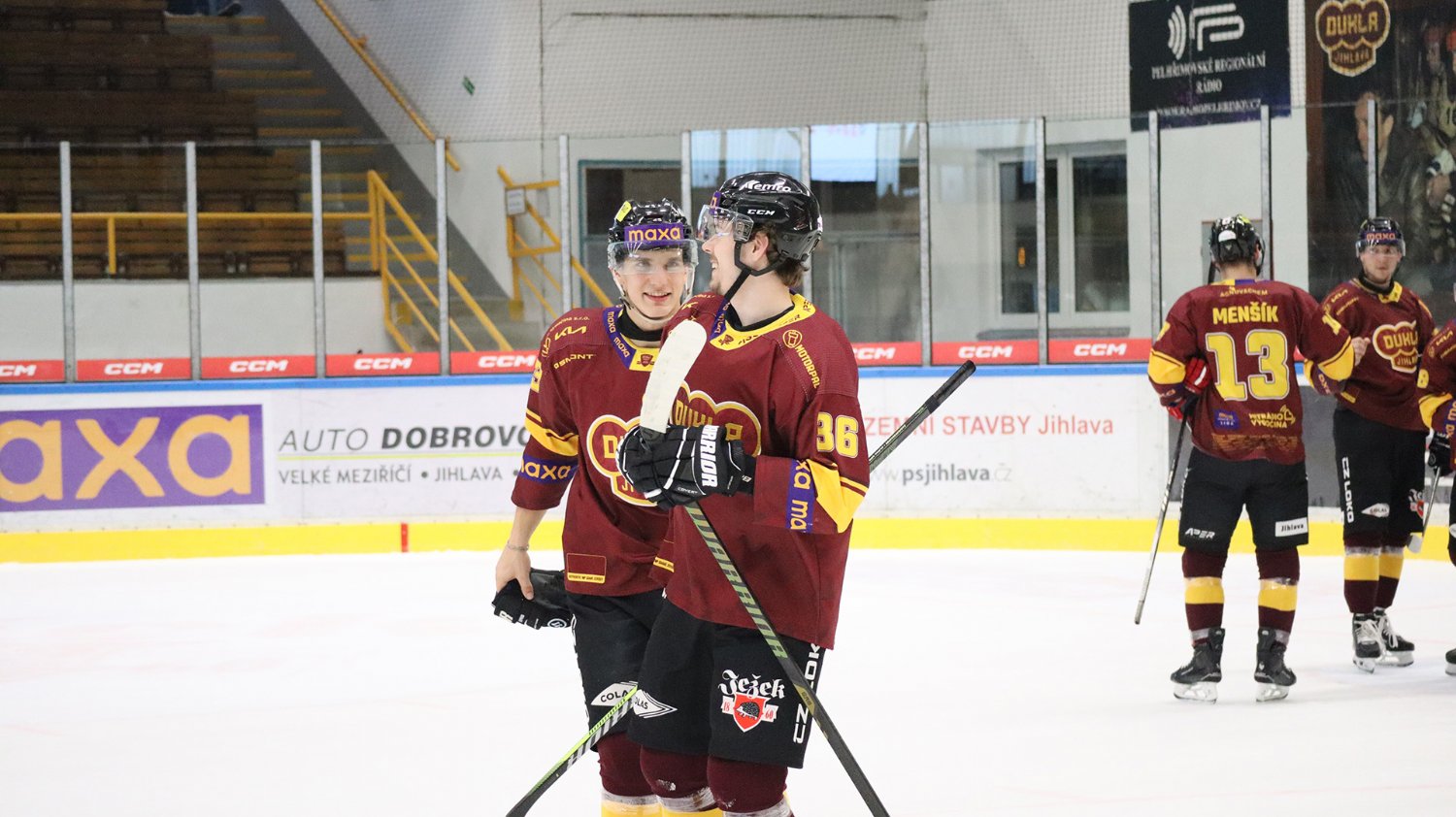 Tomáš Jáchym s číslem 77 za brankou bojuje o puk