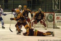 Odhodlání Jihlavy odčinit debakly z minulých vzájemných zápasů se jevilo být nesnadným úkolem hned od úvodních minut utkání. Chomutov svým přístupem v úvodu naznačil, že nechce nechat body domácím bez boje, důkazem byla aktivní hra hostů a vypracované úvodní šance. Již ve 2.minutě musel totiž Řehoř zasahovat vleže proti Jeslínkovi, který využil hrubé chyby v jihlavské rozehrávce, o minutu později jihlavský brankář úspěšně likviduje šanci Kuncla, který byl po objetí branky ve slibné pozici, ovšem radost mu překazil právě jihlavský brankář. Tlak Chomutova v úvodu nepolevoval, ale Dukla s dobře chytajícím brankářem i trochou štěstí odolává, když puk po ledě těsně míjí odkrytou branku, Jíra který byl k němu nejblíže se k dorážce nedostal. Pouze u neproměněných šancí zůstalo i v případě Mikšoviče, ten po ideální přihrávce trefuje pouze dobře postaveného Řehoře. V sedmé minutě se konečně začíná prosazovat i Dukla, když po několika předchozích pokusech dobýt útočné pásmo pálí tvrdou střelou Čachotský, ale chomutovský brankář vyráží. Ke vstřelení gólu jihlavské Dukle nepomohla ani přesilová hra, kdy byl za hákování Řípy vyloučen Heinische. Následný závar před brankou severočechů v podání Bakuse a Moravy však ke gólu nevede, ani přes několik pokusů puk protlačit za záda brankáře.Vlna dalších vyloučení přinesla několik příležitostí na obou stranách, největší šancí byla trefená spojnice Kostourkem a následně i Malinského střela od modré - puk se odrazil od zadního mantinelu zpět před Řehoře a do branky jej dorážel Hašek, brankář efektním zákrokem likviduje.V závěru třetiny udílení trestu vrcholí a bylo pravděpodobné, že začátek druhého dějství se bude odehrávat pouze se třemi hráči na každé straně. Na nedostatek příležitostí ke skórování, si tedy ani jeden z týmů nemohl stěžovat.