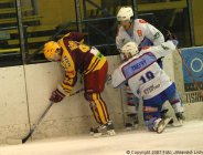 Do třetí třetiny jakoby nastoupily jiné týmy, hra získala náboj a grády, již v 5.vteřině po vyhraném buly se pěknou střelou prezentuje Bakus. Ovšem ještě v téže minutě je vyloučen Lukáč za zdržování hry a hostům se nabízí šance pro pojištění vedení. Dukla ale dobře brání. Karta se obrací a na trestnou tentokrát putuje Hašek. Jihlavští v přesilovce ovšem nechávají ujet Šípa s Bouškem, Řehoř efektivně vyráží střelu maskou. Ve zbytku přesilové hry Dukla nevymyslela zhola nic. Těsně před vypršením trestu rozhodčí posílá na trestnou i Jeslínka za hrubost po šarvátce s Moravou. Dukle se konečně daří usadit se v obranném pásmu hostů, Míka dobře pálí od modré ale k dorážce hráči Dukly neměli příležitost. O pár sekund později se ale z vyrovnání raduje Čachotský, který elegantně obchází obránce a mezerou pod betony vyrovnává - 1:1. Následně za sekání odchází na trestnou lavici Kaňkovský, vyrovnáním povzbuzená Dukla ale nepouští Chomutov do vážnější šance, naopak Bakus v téměř stejné situaci jako před ním Čachotský je blokován obráncem, šanci tak neproměňuje, rozhodčí alespoň vylučuje Trefného za hrubost. K vidění je tak opět hra ve čtyřech na obou stranách. O minutu později je vyloučen i chomutovský Černý, další vlna vyloučení jen potvrzovala přiostření hry ve snaze rozhodnout utkání vstřelením rozhodujícího gólu. Domácí tentokrát neváhají a v přesilové hře 5 na 3 otáčí vývoj zápasu, když posílá puk do sítě Rytnauer po asistenci Kaňkovského- 2:1. V dalších minutách, po vyloučení Dobrovolného se hra odehrává především ve středním pásmu ve čtyřech. Vzrušení nastalo, když Dobrovolný po návratu z trestné dostal dobře mířenou přihrávku, svou střelou od modré však míjí branku. Následně dostává příležitost zahrát si další přesilovku i Chomutov, ovšem domácí s vidinou zisku tří bodů dobře brání a dokonce Bakus chvíli sbírá potřebné vteřiny v rohu za brankou hostů. Na druhou stranu ale za zmínku stojí i dobrá střela Gombice od modré, se kterou měl domácí Řehoř značné problémy. V následném úniku je Čachotský faulován. Ve vyplynulé přesilové hře Dukla semkla severočechy v jejich třetině a Rytnauer opět po přihrávce Kaňkovského zvyšuje na 3:1. Hektický závěr posledního dějství divákům nahrazuje nepříliš zajímavý průběh z předchozí třetiny a když o dvacet vteřin později přidává další gól do sítě hostů Řípa, je definitivně rozhodnuto- 4:1 Jiskřičku naděje se ještě v závěru pokusil vykřesat v početní výhodě Jíra, který snižuje na 4:2, ale ani v následné hře bez brankáře severočechů se skóre nemění, Dukla tak v důležitém zápase poráží svého soka 4:2, když po nepříliš pohledných dvou třetinách hokejisté přichystali atraktivní podívanou pro všechny diváky.