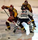 Závěr zápasu patřil především domácímu golmanovi, který předváděl v brance neuvěřitelný výkon. Do lapačky skryl dělovku Hodka, skokem se vrhnul po střele Maleny do prázdné branky, v rozkleku zlikvidoval lapačkou a dělovku obránce Kašpara. Čtvrt minuty před koncem posunul úmyslně branku Petr Kolmann a bylo nařízeno trestné střílení. Proti Stejskalovi se postavil Bakus, domácí brankář byl ale nepřekonatelný a ani kosmetickou změnu skóre nepřipustil.