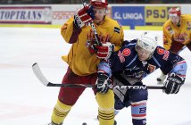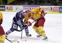 Druhá třetina nepřinesla polevení ani jednoho z celků. Hra přinášela čím dál více důrazu na obou stranách. Z toho také pramenila řada vyloučení. Při hře 4 na 4 poslal na Hanuljaka nepříjemný skákavý kotouč Daniel Hodek. Ač měl bídnou razanci, chomutovskému gólmanovi slušně zavařil. Ve 26. minutě odešel na trestnou lavici pykat Tomáš Pitule. Také hostující celek si ale přesilové hry nevážil a vzápětí o ní přišel. Vysokou holí atakoval domácího forvarda Miroslav Hanuljak. Byl to opět Chomutov, který využil většího prostoru na ledové ploše. Střelou švihem nad lapačku v čase 27:32 uspěl Marek Sikora - 2:3. V pokračující přesilové hře domácích se i přes pár pěkných příležitostí skóre neměnilo. Nedovolených zákroků bylo skutečně požehnaně. V dalším početním deficitu podržel Duklu Marek Benda, který předvedl pár skutečně dobrých zákroků. Také díky němu jí domácí přežili bez úhony. Minuty, spějící k závěru druhé dvacetiminutovky, přinášely velice atraktivní a pohledný hokej. I přes přesilovou hru domácích však závěř třetiny už žádnou branku nepřinesl.