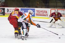 Úvodní minuty zápasu přinesly velmi vlažný hokej. Ani jedno mužstvo nehýřilo přílišnou aktivitou. Ke zvýšené atraktivitě nepomohly ani početní výhody, jež si oba celky vyzkoušely. Největší příležitost prvního dějství přinesla až 15. minuta. Tomáš Petráček zavezl kotouč do útočného pásma, načež jej poslal před branku. Najíždějící Tomáš Čachotský ale ve stoprocentní šanci trefil pouze tyč Valentovy brány. Kýženého gólu se ale domácí přeci jenom dočkali. A to v čase 19:12, když střelu Michala Jeslínka dorazil do odkryté klece bojovný Petr Domin – 1:0. Dukla tak těsně před koncem nevýrazného úvodního dějství strhla vedení na svou stranu.