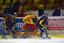 Začátek třetí třetiny byl hodně opatrný, což zřejmě byla předzvěst blížící se gólové smrště. Novou krev Drakům nenalila ani přesilová hra. Jihlava vycházela ze zajištěné obrany, přes kterou se hosté jen stěží dostávali. Když v čase 50:22 předvedli domácí hezkou gólovou akci, zdálo se být rozhodnuto. V situaci dva na jednoho vyzval Důras ke skórování Skořepu. Jeho pokus o bekhend ještě Zelenka ustál, domácí snajpr se netrefil, leč Důras za brankou znovu získal puk, naservíroval jej Ondřeji Beránkovi a jeho úloha s názvem „Jak doklepnout puk do odkryté klece“ již byla snadná. Salith se nevzdal. Miškovského střela z pravého kruhu ještě úspěšná nebyla. O chvíli později tak dlouho míchal Milfait s pukem za brankou, až si počkal na chvíli, kdy mu před Škarka přijede Tomáš Fořt, potvrdivší střelou z první post nejproduktivnějšího Draka. Bodové naděje hostí sťal za minutu David Březina. Prokš jej našel na pravém kruhu a z těchto pozic se domácí mladík moc často nemýlí, což potvrdil. Půlminuty před koncem nahrál Štebih puk rozjetému Janu Kolářovi, jenž střelou z pravé strany vymetl pravý horní roh branky - 5:1.
