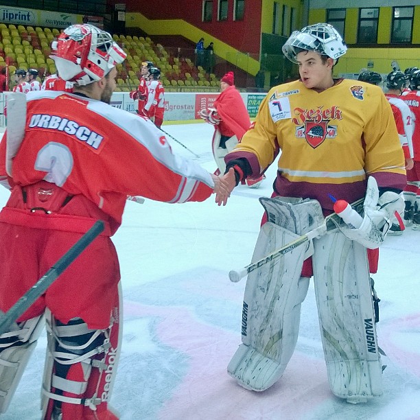 VÝHRA NAD OLOMOUCÍ. Jihlava v důležitém zápase DHL extraligy juniorů porazila na vlastním ledě Olomouc. V duelu dvou gólmanů se jmény Jakub mohl jihlavský Škarek (ve žlutém) přijmout gratulaci od Urbische z Olomouce. Autor: Zdeněk Drla.