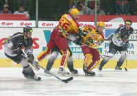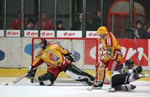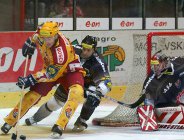 V první třetině si diváci v Hostan aréně příliš pohledného hokeje neužili. Oba týmy hrály dlouho dost zakřiknutě bez vyloženějších gólových šancí. V úvodu Orli nevyužili přesilovku, když před Masalskisem neuspěla Pucherova formace, posléze se neujalo ani obstřelování branky Tomanem a Bičánkem. Hra se potom přelévala na obě strany, ale postrádala větší náboj a rychlost. V polovině dvacetiminutovky se poprvé výrazněji představila nová posila Znojma Zdeněk Blatný, když po obkroužení branky přihrál Bičánkovi, jenž ale střelou našel jen připraveného jihlavského gólmana. Další početní výhodu domácí nesehráli vůbec dobře a téměř k ničemu se nedostali. Dukla potom měla k dispozici rovněž dvě přesilovky, v nichž si vytvořila několik málo šancí. K té největší se dostal střelou od modré Ficenc, Slávik byl však na místě. Ve vlastním oslabení ujel znojemský Erat, podařenou kličkou si položil Masalskise, ale nedokázal přehodit jeho betony. I při vyloučení Rachůnka nejprve zahrozili Jihlavští a Slávika museli zastoupit po změti před brankou spoluhráči. Necelou minutu před sirénou ještě nahazoval na branku hostí Čakajík a Haman ve vzduchu tečoval. Masalskis skočil po kotouči, který mu ale unikl a směřoval mimo branku.Až do poloviny druhé třetiny byl obraz hry téměř shodný s prvním dějstvím. Obě mužstva hrála poněkud laxně, více příležitostí si vytvářeli Orli – po Bičánkově nápřahu zaduněl Masalskisův beton – Dukla ale zabednila obranu a k ničemu výraznému je nepouštěla. Tři dobré příležitosti si vypracoval Vostřák, Slávik byl ale pokaždé v pohotovosti. Ludvík potom napodobil Bičánka, když trefil jen lapačku lotyšského gólmana. V 30. minutě po závaru, resp. skrumáži před jeho brankou pálil natřikrát do prázdné Čakajík, 1:0. I když Znojmo po gólu trochu ožilo, Jihlava se nepoložila rovněž domácího brankáře několikrát prověřila. V 37. minutě se dočkala i vyrovnávací trefy. Mareš dlouhou dobu operoval za Slávikovu brankou a obráncům Znojma se ho nedařilo eliminovat. Přihrál před branku Ivanu Padělkovi, který z první trefil levý horní roh znojemské svatyně, 1:1. Dvě obrovské šance potom spálili těsně před Masalskisem Plášek s Uramem, při vyloučení Ficence se ale dokázal podruhé v utkání prosadit Čakajík, kterého přesně našel u pravé tyčky znojemský d’Artagnan, 2:1. Osm vteřin před sirénou ještě vyjel do útočného pásma a vystřelil. Slávik po střele reflexivně máchl lapačkou.