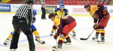 První minuty byla Dukla aktivnější celek a hostům z Kazachstánu nepůjčovala kotouč. Na konci třetí minuty mladý debutant Chlubna obral na útočné modré čáře o kotouč obránce hostí, navázal na sebe dalšího hráče a předložil před kasu Půžovi, ten ale trefil pouze přesunujícího se Demidova. První přesilovka se naskytla domácím v 8. minutě, kdy byl vyloučen Borovikov za hákování. Hosté se ale bez potíží ubránili, zanedlouho šli ale do oslabení zase. Po tvrdém Dovgaňově zákroku na Suchánka se trochu jiskřilo, hostující hráč byl vyloučen na 2+10 minut za zásah do oblasti hlavy a krku. Během druhé početní výhody měl úvodní gól na holi Osmík, trefil ale pouze masku Demidovova. Oba týmy byly často vylučovány, více v první části ale Dukla, hosté nedokázali ale mnohdy přejít přes modrou čáru. 25 sekund před koncem úvodní periody byl vyloučen Štebih a do druhé části si pak Kokšetau přenesl přesilovou hru.