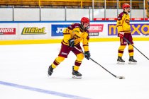 Jihlavští dorostenci nevstoupili do zápasu příliš dobře a na konci 3. minuty inkasovali úvodní gól. Po nevydařené rozehrávce domácích získal puk Hlaváček, který ho poslal na pravý kruh pro Jaroslava Šedivého, jenž udělal tři kroky vpřed a trefil se nad vyrážečku Moravy na vzdálenější tyč. Velkou šanci měli hosté i při vlastní přesilovce, ale domácí při velkém provozu před brankou zvládli puk udržet před čárou. Zvládnuté oslabení dodalo Dukle sil a brzy přišla přesilovka i na červenožluté straně, která byla po 13 sekundách využita. Lexa poslal puk na střed modré Haškovi, který ho předal na pravou stranu Temlovi. Ten mu kotouč vrátil a Jindřich Hašek propálil od modré zcela vše – trefil se nad lapačku gólmana k tyči. Přesilovou hru ale využili na konci třetiny i hosté a šli do kabin spokojenější. Martinec výborně vykombinoval akci na Sedláčka, který z levého kruhu ještě neuspěl, ale Adam Višňar dorážel zblízka do prázdné klece - 1:2.